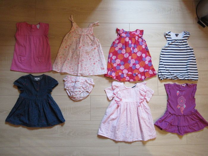 (la rose claire en bas sur la 4ème photo est neuve, juste lavée) (la rouge avec le slip assorti sur la 1ère photo est en parfait état comme neuve, marque Sergent Major) (la robe blanche avec le slip assorti sur la 4ème photo est en 9 mois mais taille 12 mois)