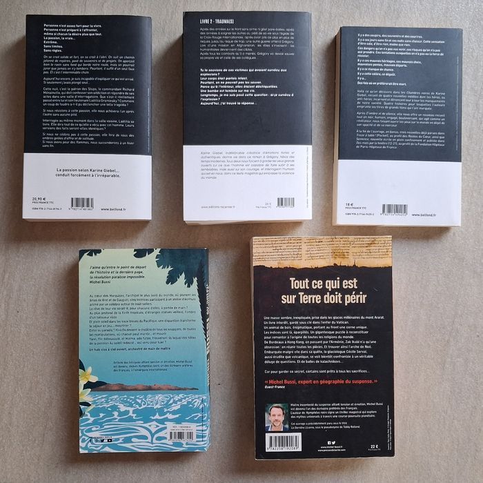 ⚠️Cette annonce comprend 2 romans. 3 ont été vendus⚠️ Livre 2 - Traumas (VENDU) Ce que tu as fait de moi (VENDU) Chambres Noires (VENDU) ✏️ Tout ce qui est sur Terre doit périr Edition Presses de la Cité Prix éditeur : 22 € Bon état ✏️ Au Soleil Redouté Editions De Noyelles Prix éditeur : 21.9 € Bon état Livraison acceptée Ou remise en main propre possible sur Paris, La Défense, Etampes, Bibliothèque François Mitterrand, Gare de Lyon, etc...