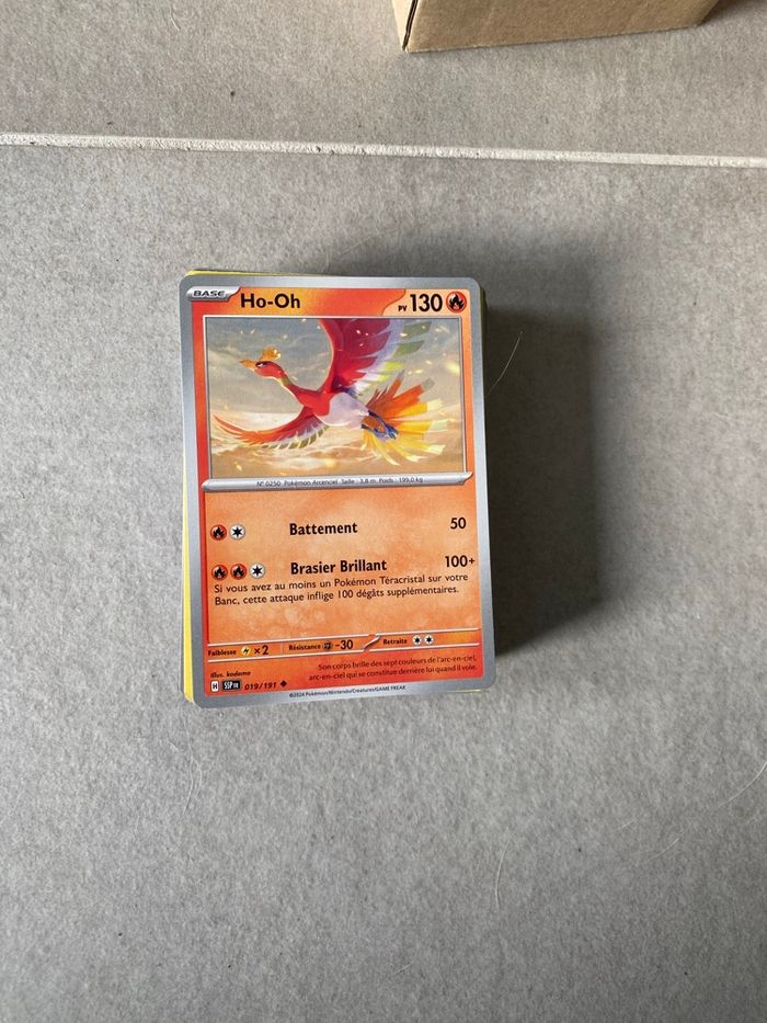 Bonjour Vends lot de 200 cartes Pokémon officielles issues de différentes séries. Lot composé de 190 cartes communes et de 10 cartes reverses holographiques. Idéal pour offrir une collection à un enfant. Tags : Matuvu57 lot cartes Pokemon lot 100 cartes lot 200 cartes Pokémon lot cartes reverses lot reverse lot holo lot holographique lot cartes holo cadeaux enfants Kanto (Gen 1) • Pikachu • Dracaufeu • Bulbizarre • Salamèche • Carapuce • Mewtwo • Mew • Ectoplasma • Rondoudou • Psykokwak • Leviator • Noadkoko • Arcanin • Lokhlass • Ronflex Johto (Gen 2) • Togepi • Mentali • Noctali • Lugia • Ho-Oh • Celebi • Scarhino • Tyranocif Hoenn (Gen 3) • Rayquaza • Groudon • Kyogre • Braségali • Gardevoir • Métalosse Sinnoh (Gen 4) • Lucario • Dialga • Palkia • Giratina • Darkrai • Garchomp Unys → Paldea (sélection moderne) • Zoroark • Greninja • Mimigal • Mimiqui • Évoli • Sylveon • Dracaufeu