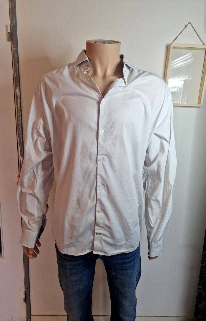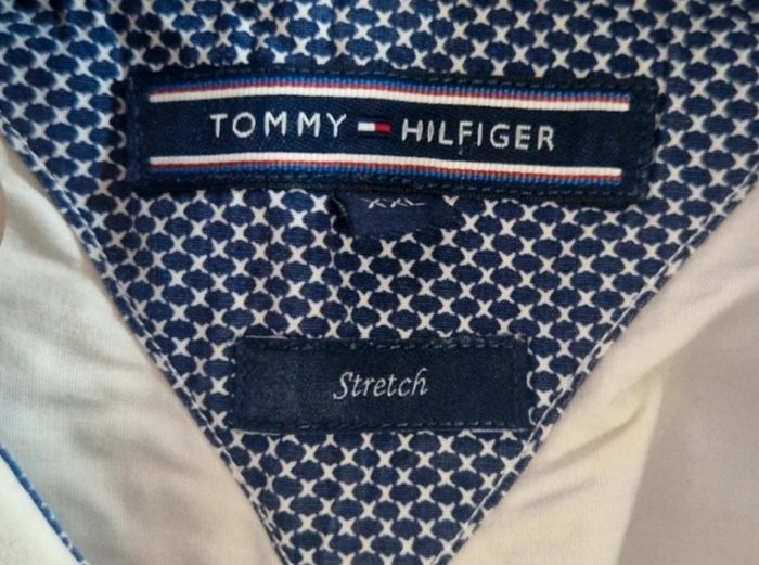 Bonjour ! Voici un basique efficace pour un look décontracté. Cette chemise blanche classique bénéficie d'une coupe stretch pour un confort optimal, idéale sous un pull en cette saison. ​Style : Business / Casual ​Coupe : Stretch / Ajustée ​Sexe : Homme ​Taille : XXL ​Matière : 97% Coton, 3% Élasthanne ​Longueur : 77 cm ​Largeur (aisselle à aisselle) : 62 cm ​L'article est en très bon état. Le tissu est sain, les poignets et le col sont propres. Aucun signe d'usure majeur. ​#homme #tommyhilfiger #office #mode #trend #tendance #quality #qualité #business #classic #banger