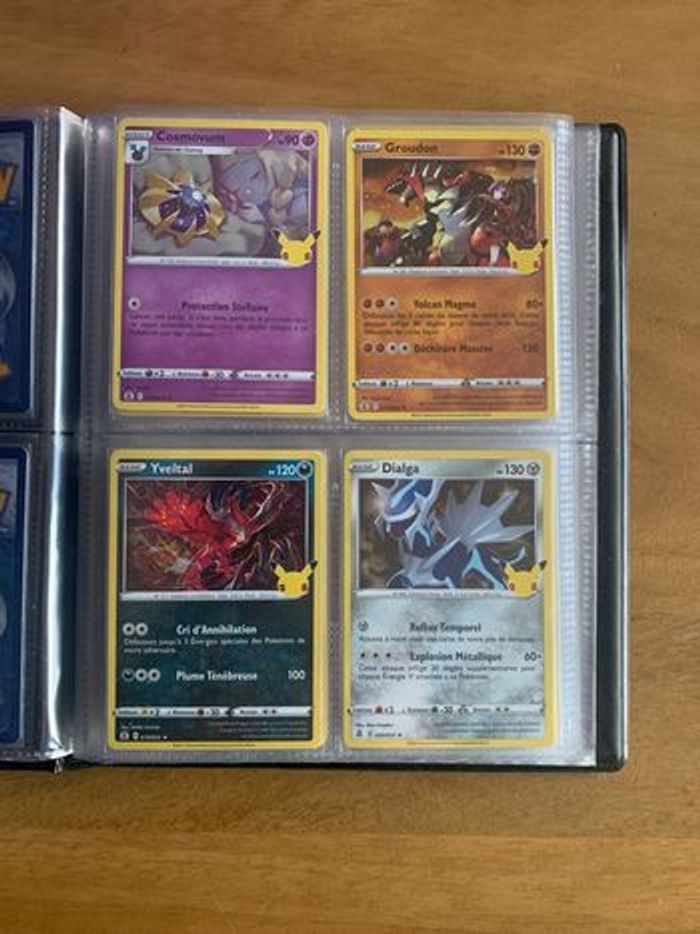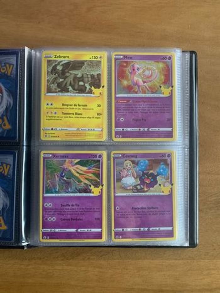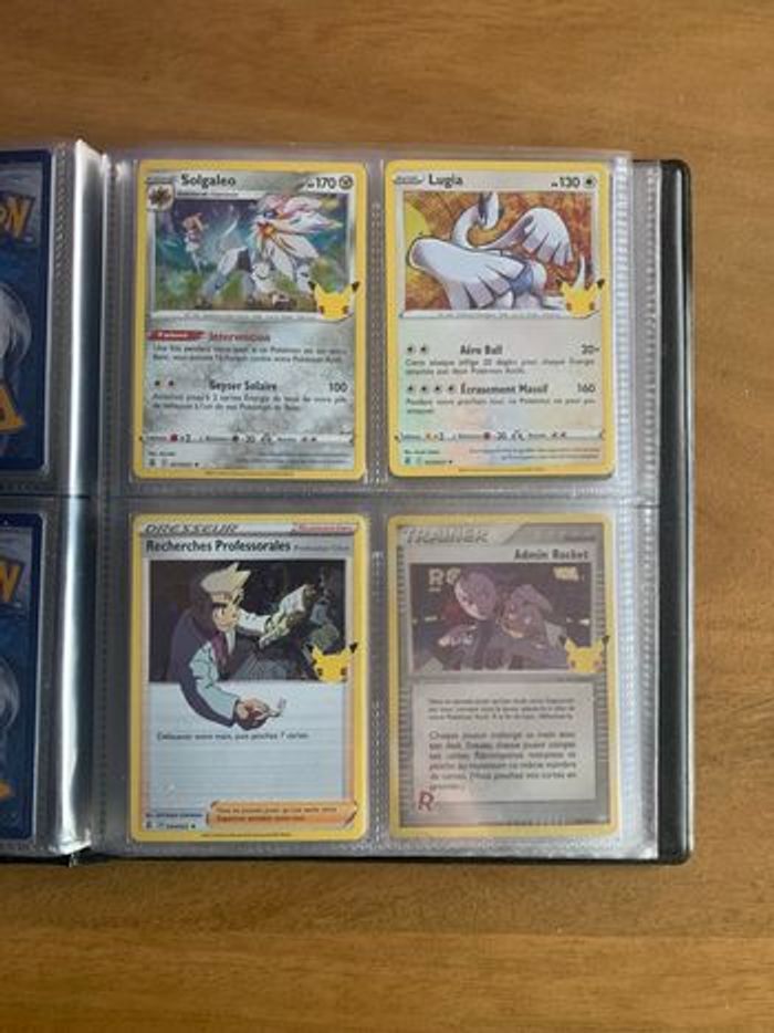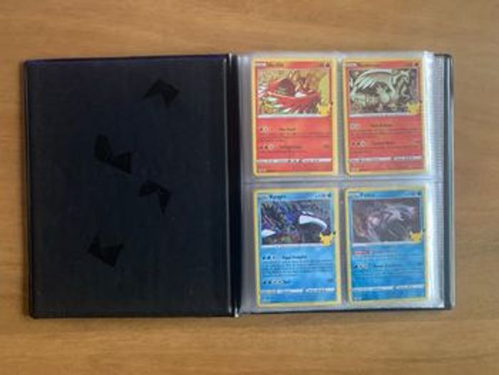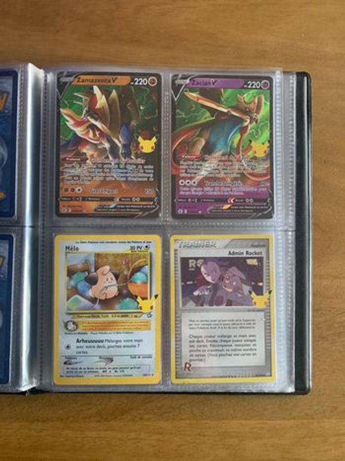 Classeur Pokemon Célébrations 25 ans comprenant les 15 cartes holographiques de la Serie ainsi que 4 cartes Ultra Rares : Zacian V 016/025, Zamazenta V 018/025, Melo 20/111 et Admin Rocket 86/109