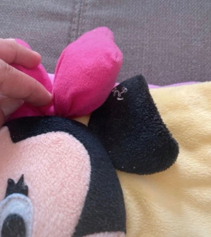 Coussin pour ranger le pyjama Coussin Minnie Le noeud n’est plus accroché aux oreilles (voir photo) L’étiquette a été découpé Vous achetez ce que vous voyez sur les photos