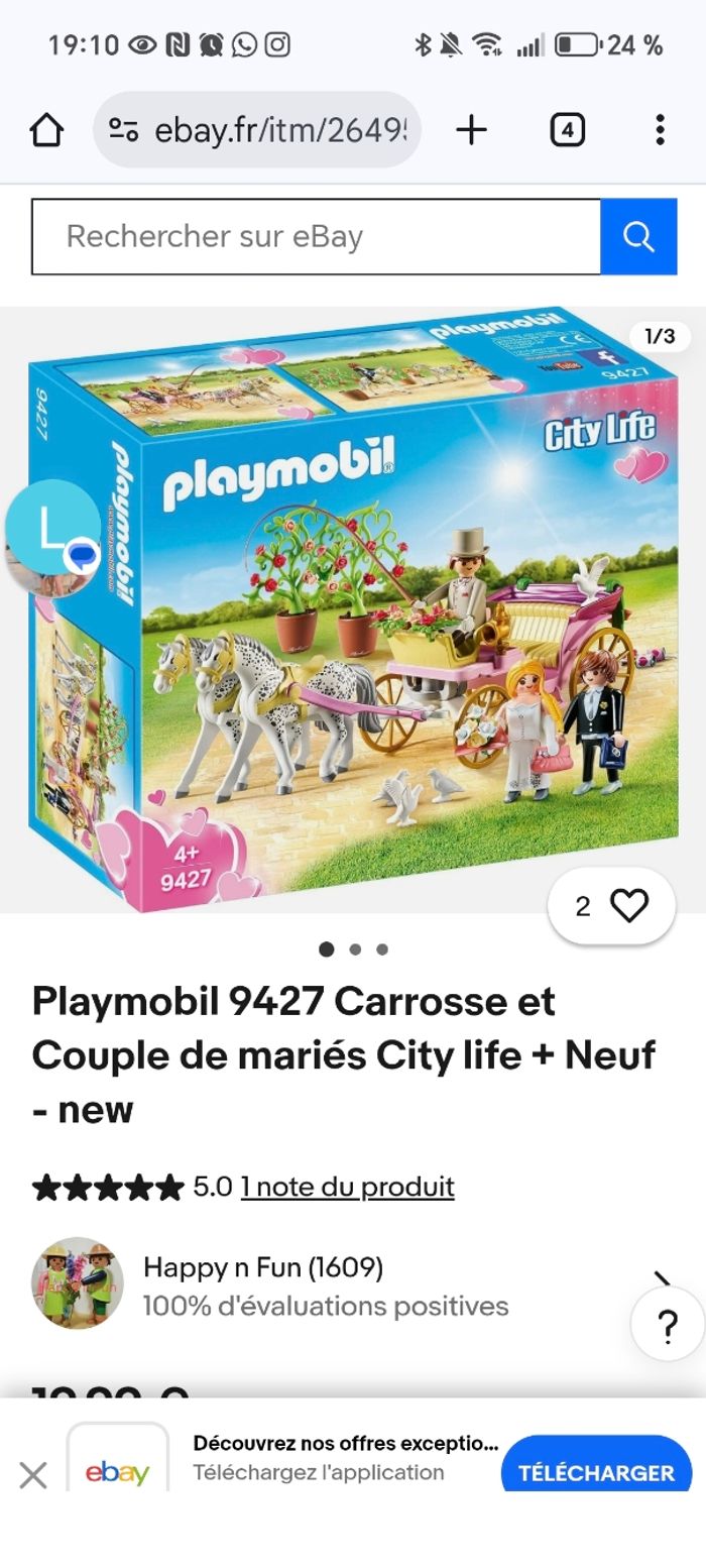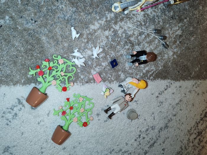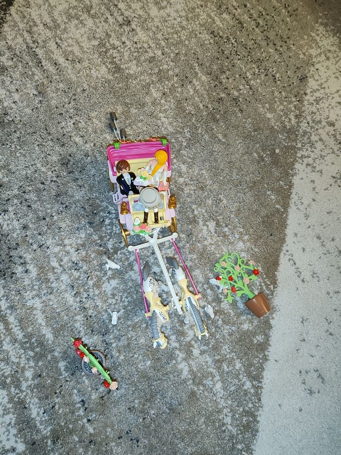 Bonjour Je vends la calèche playmobile 9427 Malheureusement il manque un bouquet de fleur devant le conducteur de la calèche et la cravache Malheureusement je n'ai plus la boîte car elles étaient dans mon sous sol qui a été inondé