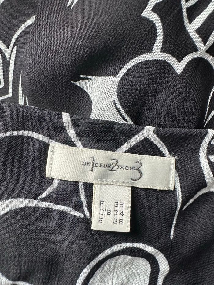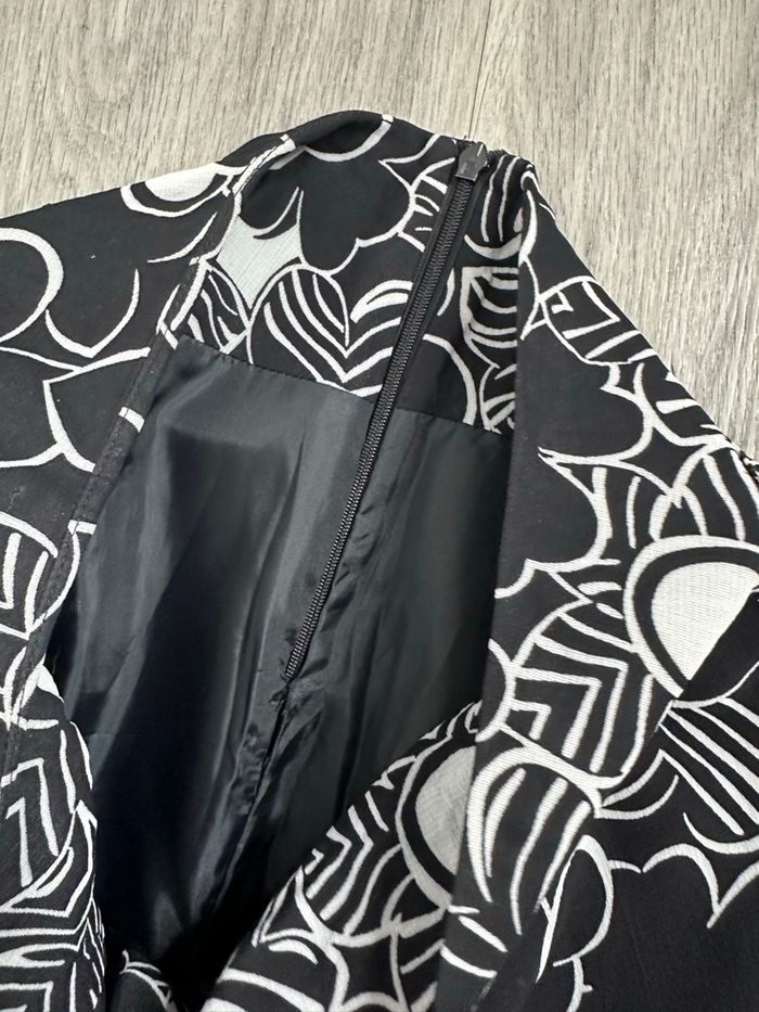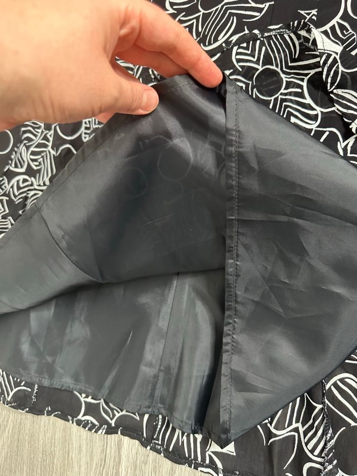 Jupe - Excellent état - Taille 34 équivalent XS Dimensions en bas de l’annonce - Noire et blanche - 123 Paris - Se ferme avec un zip - Seventies, flower power - Doublure intérieure - Pas d’étiquette de matière Dimensions: - 34cm à la taille - 60cm de long L’étiquette indique une taille 36 mais les dimensions correspondent à du 34.