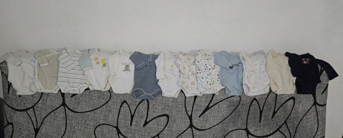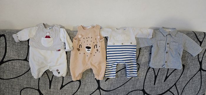 Lot pour bébé 1 mois, plusieurs marques (Vertbaudet, monoprix, Obaïbi, Orchestra, Jacadi, DPAM, Kimbaloo, Disney, TAO, Kitchoun, ....) : - 1 gygoteuse matière douce - 1 combinaison manteau - 8 pyjamas - 13 bodys - 3 Tshirts ML - 3 pantalons - 3 vestes - 3 combinaisons/salopettes - 1 gilet - des chaussons - 3 bonnets 20€ les 42 pieces, soit 47 centimes la pièce