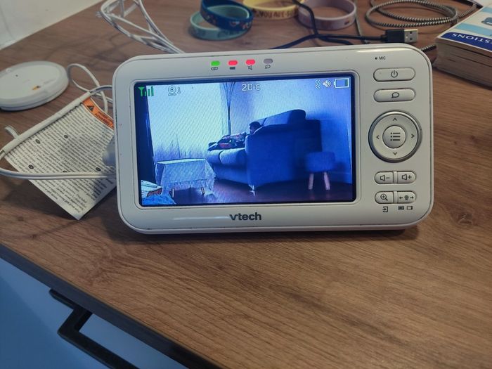 Prix neuf 198 euros Portée de 300 mètres maximum en champ libre (50 à 60m en intérieur). Unité Parents : - Écran couleur 5 pouces - Contrôle du zoom à distance (zoom x1.33) - Micro intégré pour communication à distance avec Bébé - Mode éco : activation du son sans l’image - Mode silencieux - 4 indicateurs lumineux : connexion perdue, batterie faible, HP éteint, communication avec Bébé - Alertes sonores : connexion perdue, batterie faible, température - Contrôle du volume sonore (7 niveaux) - Pied ajustable : se pose partout - Caméras supplémentaires compatibles Unité Bébé : - Caméra orientable manuellement - Caméra infrarouge automatique - Capteur de température avec alerte sonore sur unité Parents - Réglage de la sensibilité (5 niveaux) - 5 berceuses déclenchables à distance et 4 bruit blanc (battement de cœur, pluie , aspirateur, forêt) - Contrôle du volume sonore Fonctionne avec batterie rechargeable pour l'unité Parents et adaptateur secteur inclus pour l'unité Bébé. Puissance maximale utilisée par l’émetteur : 0.1W (100mW)
