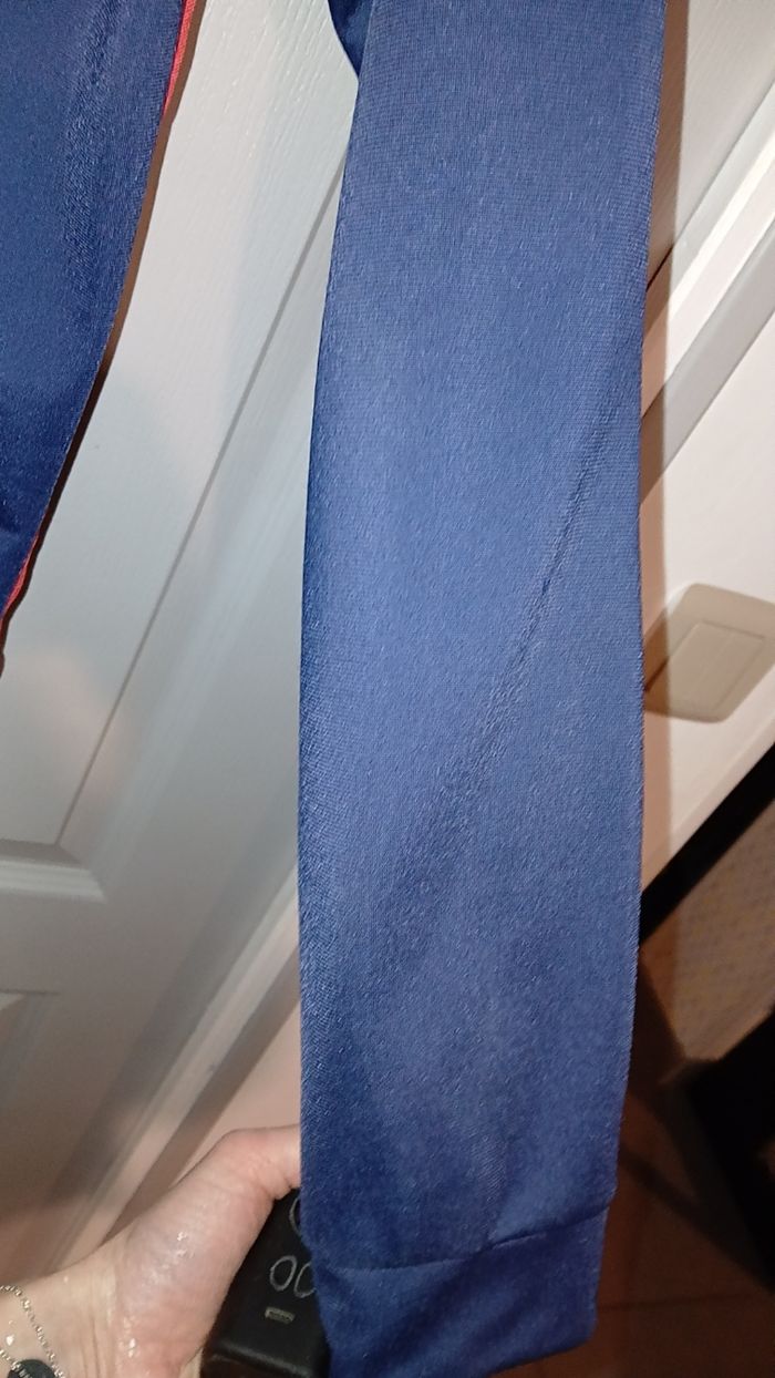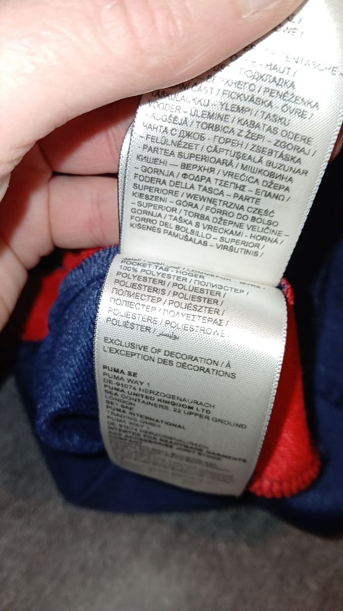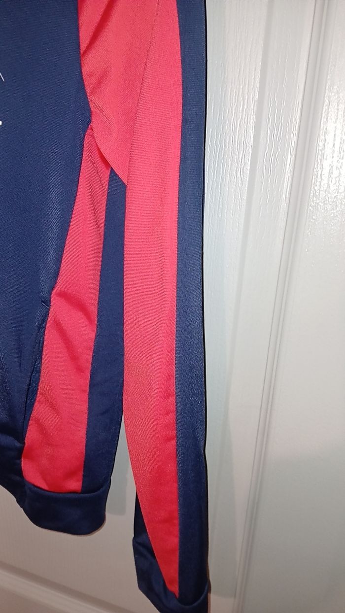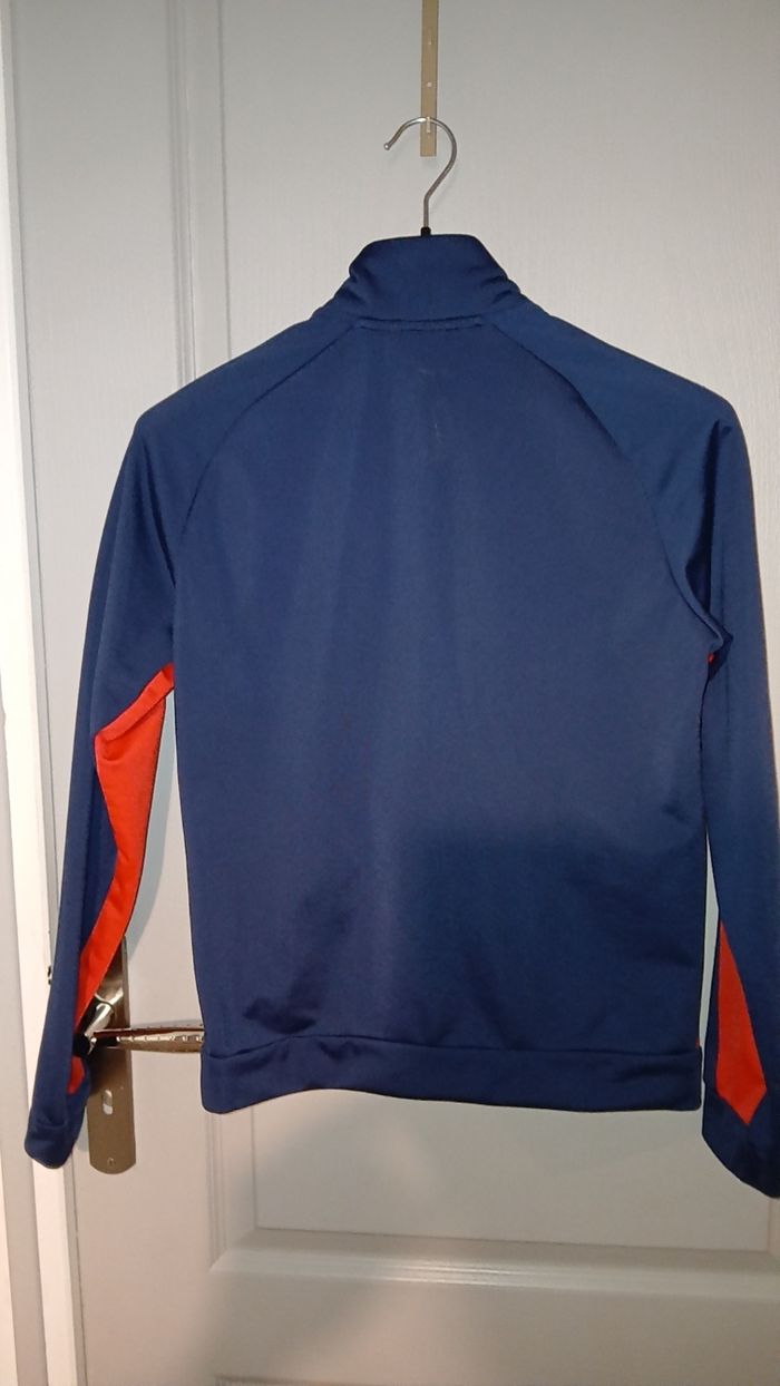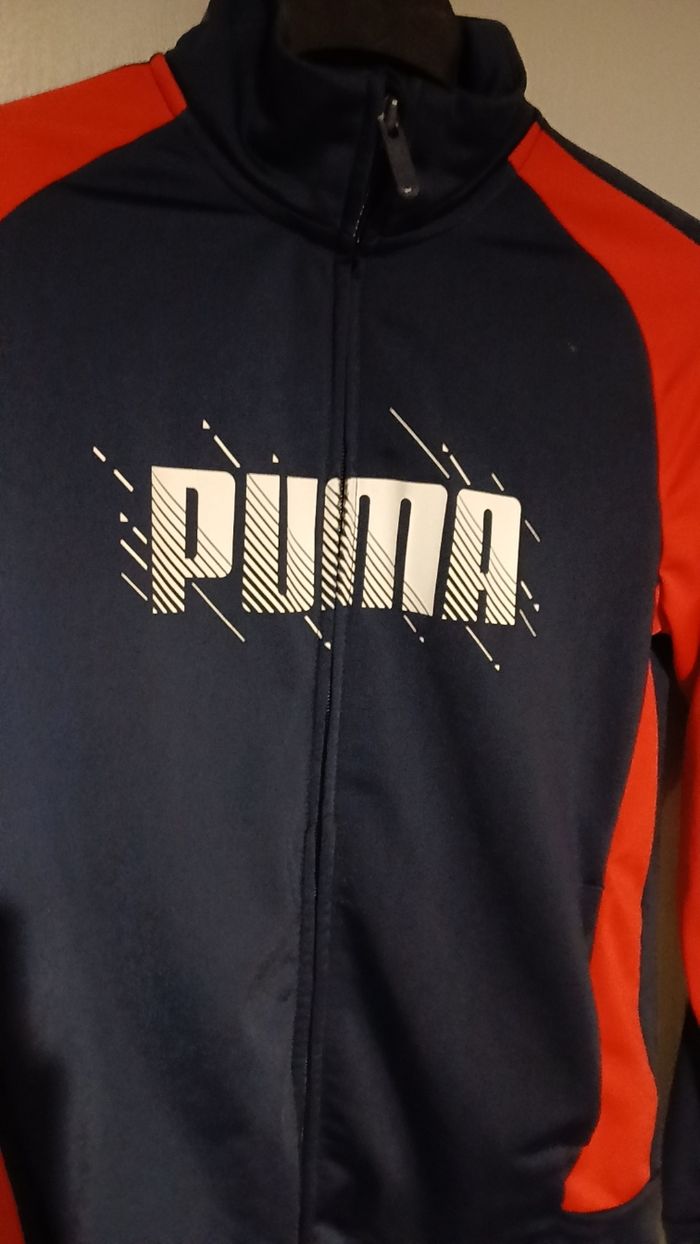 Veste en très bon état, de marque puma, avec fermeture éclair. Taille 11-12 ans. 100 % polyesther. Couleur bleue marine et rouge.