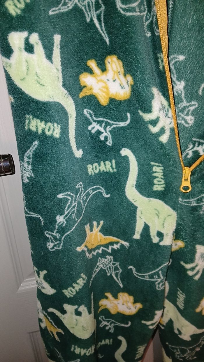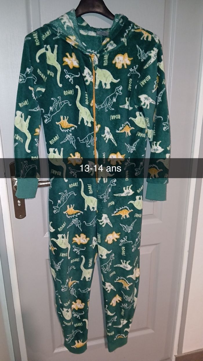 Pilou, pyjama une pièce avec capuche, de couleur vert motifs dinosaures. De marque 9th avenue très bon état. 100% polyester, taille 158-164 cm soit 13-14 ans.