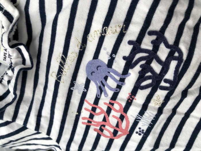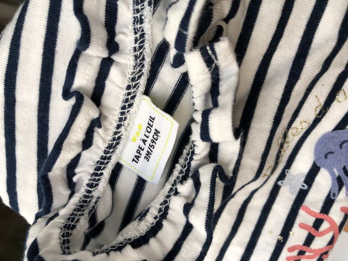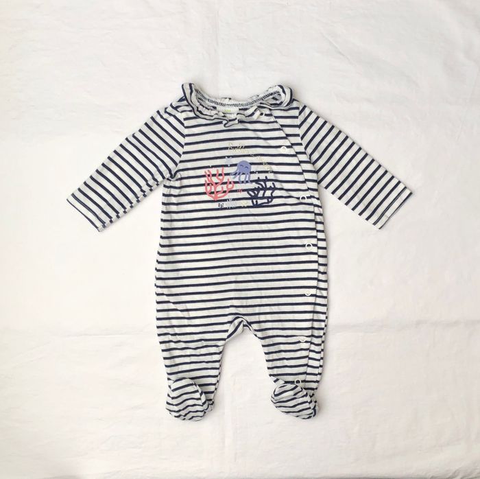 Pyjama une pièce, grenouillère, dors bien Tape à l’œil, Taille 3 mois/ 59 cm, Ete/ mi-saison. Trop mignon, en coton style marinière, rayé blanc et bleu marine. Motif floqué d’une pieuvre, de coraux, d’algues, dans les tons roses, bleus. Inscription dorée : « bulles d’amour ». Collerette autour de l’encolure. Ouverture par pressions sur tout l’avant (le côté). En très bon état, sans trou ni tache. 🌸 Vous aimez cet article ? N’oubliez pas de visiter le reste de mon dressing en filtrant les tailles.