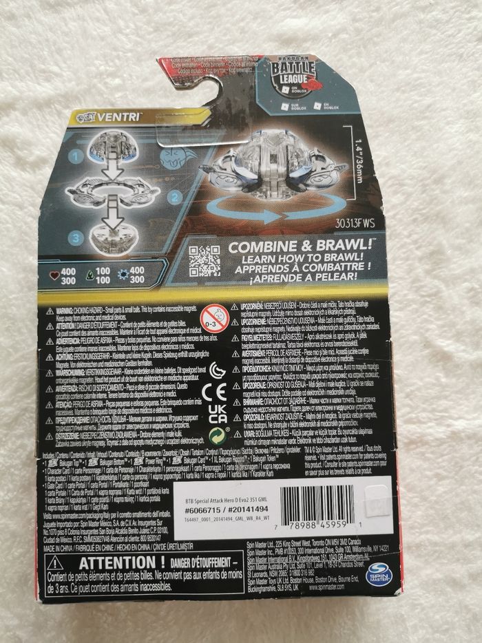 - 1 arène de combat avec zones d'exposition, 1 Bakugan Special Attack Dragonoid, 1 anneau, 1 lanceur, 1 carte Personnage et 1 carte Portail. L'arène mesure plus de 40 cm de long. Prépare ton Bakugan en l'assemblant à l'anneau et au lanceur puis lance-le à toute vitesse pour l'ouvrir grâce à une attaque spéciale. Les billes Bakugan se déploient et se transforment en créatures fabuleuses lorsqu’elles sont envoyées correctement sur les cartes aimantées. Des combats épiques pour les enfants. Chaque Bakugan est aussi un casse-tête miniature : il faut apprendre à maîtriser son mécanisme de fermeture unique. - Bakugan Battle League - Pack Spécial Attack : Ventri. Prépare ton Bakugan en l'assemblant à l'anneau et au lanceur puis lance-le à toute vitesse pour l'ouvrir grâce à une attaque spéciale - Les billes Bakugan se déploient et se transforment en créatures fabuleuses lorsqu’elles sont envoyées correctement sur les cartes aimantées. Des combats épiques pour les enfants - Chaque Bakugan est aussi un casse-tête miniature : il faut apprendre à maîtriser son mécanisme de fermeture unique. Comprend : 1 Bakugan Special Attack, 1 anneau de combat, 1 lanceur, 1 carte Portail, 1 carte Personnage et 1 carte Special Attack #stephanie89240jouet #stephanie89240toupie