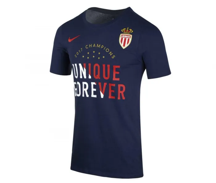 T-shirt AS Monaco Champions, coloris Bleu. T-shirt collector célébrant le 8e titre de Champion de France de l'AS Monaco. Coupe ajustée. 100 % coton pour 100 % de douceur. Agréable à porter. En savoir plus : - Col rond côtelé pour un confort parfait - Ecusson du club monégasque et logo Swoosh de part et d'autre de la poitrine - Inscription "2017 CHAMPIONS UNIQUE FOREVER" sur la poitrine - 8 étoiles célébrant les 8 victoires de l'AS Monaco en Championnat de Ligue 1