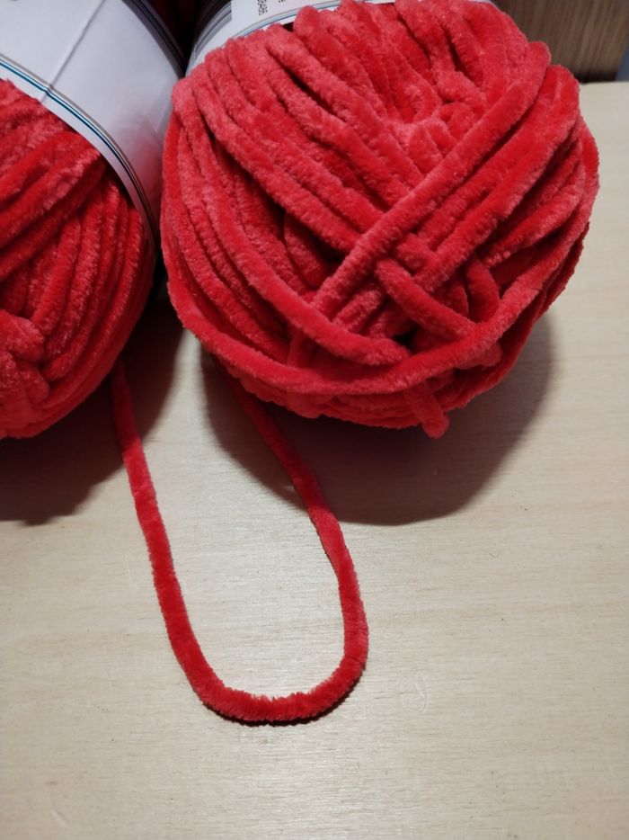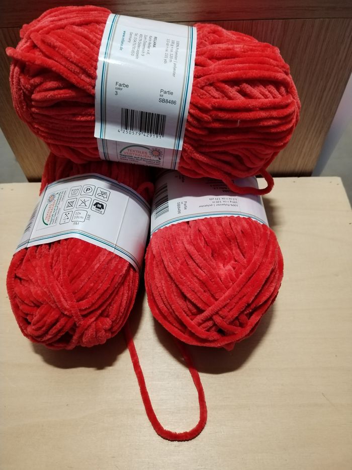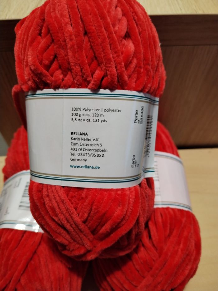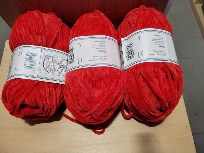 Lot de 3 pelotes (300 g) de laine chenille / velours rouge Parfait pour vos projets de crochet ou tricot ultra doux ! ​Couleur : Rouge vif (très lumineux) ​Composition : 100% Micro-polyester (effet velours tout doux) ​Poids/Longueur : 100g / environ 120m par pelote Conseils d'utilisation : Aiguilles Crochet N° 6 Entretien : lavable en machine à 40 ​État : Neuf, avec bagues d’origine ​Certifié Oeko-Tex Standard 100 (convient pour les articles bébés/enfants) Idéal pour : ​Amigurumis : Grosses peluches douces, doudous ​Décoration : Housses de coussin, couvertures (plaids) ​Accessoires : Snoods, bonnets bien chauds ​Note : Envoi rapide et soigné 📦