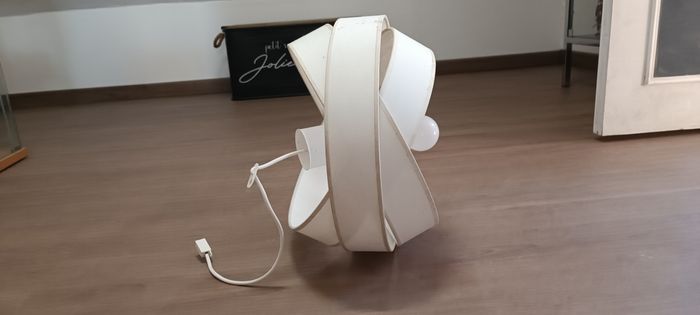 suspension textile blanc BIJOU de diamètre 38cm en très bon état juste a faire un nettoyage dessus de couleur blanc divisé en 3 anneaux réglable et une ampoule a LED prix: 5€