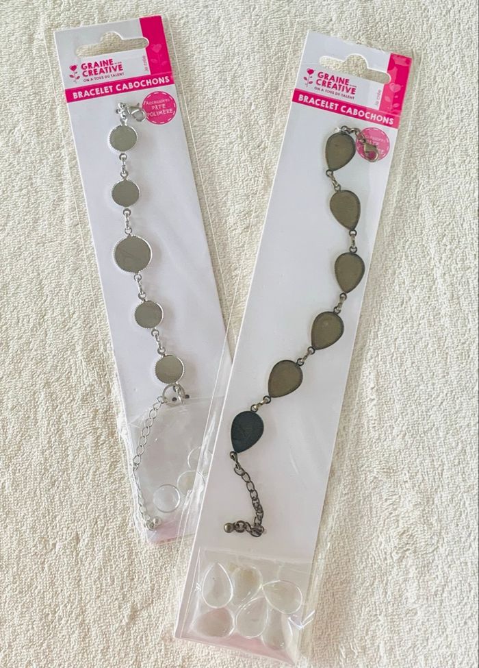 Lot 2 Bracelets cabochons à décorer Graine Créative * Bracelet rond argent + 5 cabochons longueur : 21,5 cm * Bracelet goutte bronze + 6 cabochons forme goutte Longueur : 26,5cm Vous pourrez y couler de la résine ou y mouler une pâte polymère (Fimo, Cernit, Sculpey, etc.). Neuf, sans utilisation  ⛔️ Prix FIXES, NON négociables 🚨  👏🏻 Réductions sur les lots 👍🏻 #cabochons #bracelet #loisirscreatifs #scrapbooking