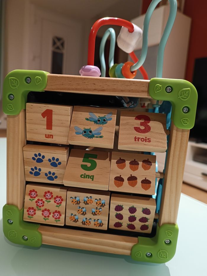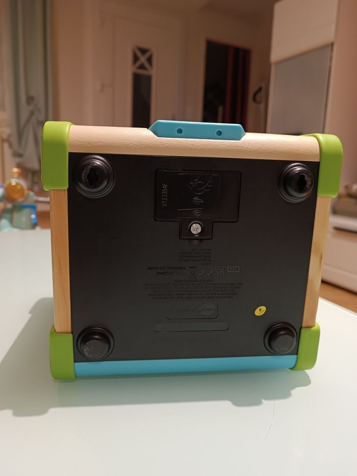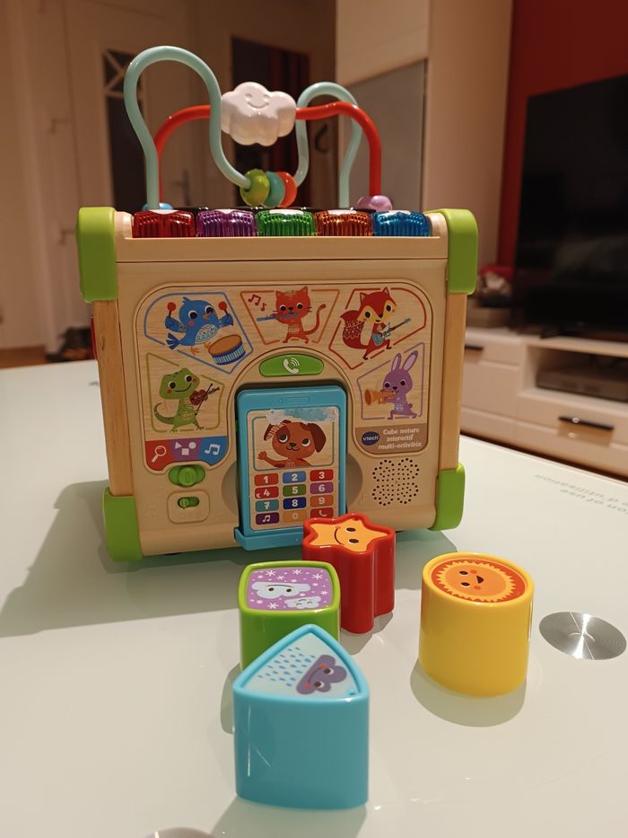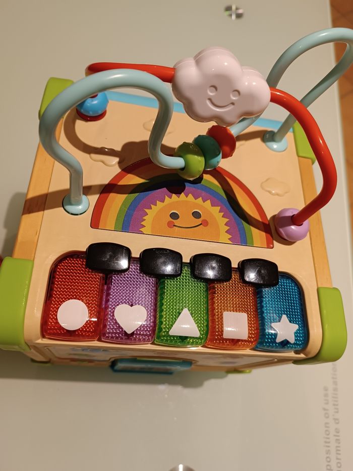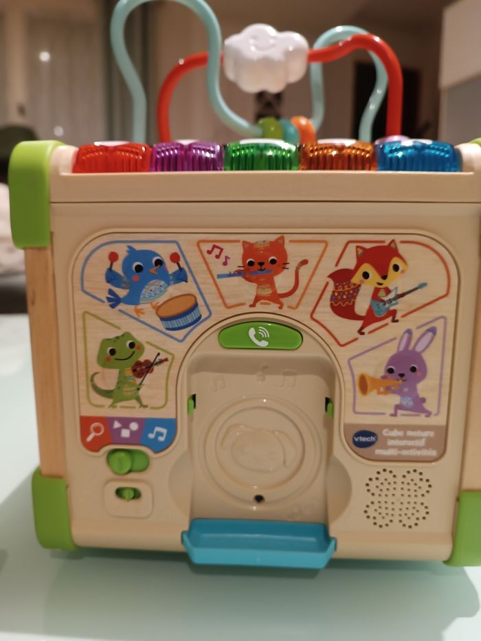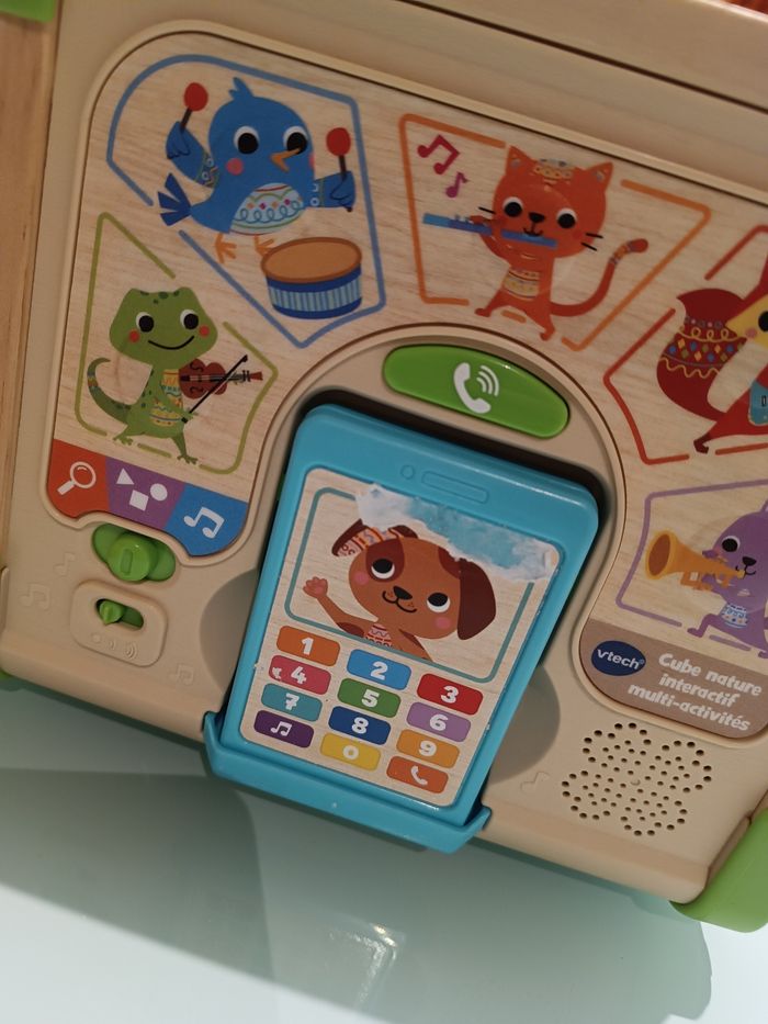 9-36 mois Vtech Complet Piles incluses Très peu servi Plusieurs activités : trieur de formes, boulier, piano lumineux, touches animaux musiciens tactiles, engrenages à tourner, écureuil et papillon à faire glisser, ... 3 modes, 2 volumes sonores Seule imperfection : voir dernière photo (partie d'autocollant manquante sur le téléphone)