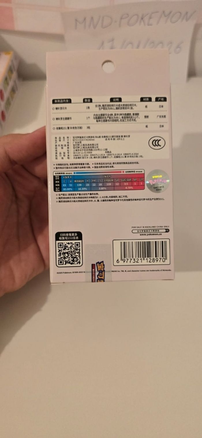 Vends coffret officiel Pokémon issu de l'extension très prisée Pokémon 151. Il s'agit de l'édition exclusive de Chine continentale (Mainland China), réputée pour sa superbe qualité d'impression. État : Neuf et Scellé (Sealed). La boîte est intacte, jamais ouverte. Contenu du coffret : Un jeton (Coin) exclusif de collection (modèle aléatoire parmi 4 variantes possibles du personnage). Une carte promotionnelle brillante. 3 boosters de l'édition Pokémon 151 (version chinoise). Détails importants : Produit 100% authentique avec hologramme officiel au dos. Idéal pour les collectionneurs de sets "151" ou de produits scellés (Sealed Collection). Envoi rapide et très soigné (protection bulle garantie). Mots-clés : #Pokemon #Pokemon151 #TCG #Collection #PokemonCards #Sealed #Neuf #PokemonChinois