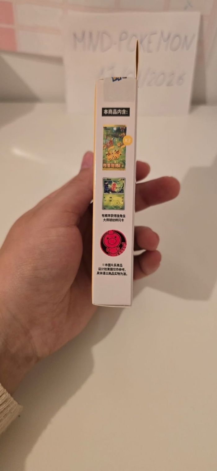 ​ Vends coffret officiel Pokémon issu de l'extension très prisée Pokémon 151. Il s'agit de l'édition exclusive de Chine continentale (Mainland China), réputée pour sa superbe qualité d'impression. ​État : Neuf et Scellé (Sealed). La boîte est intacte, jamais ouverte. ​Contenu du coffret : ​Un jeton (Coin) exclusif de collection (modèle aléatoire parmi 4 variantes possibles du personnage). ​Une carte promotionnelle brillante. ​3 boosters de l'édition Pokémon 151 (version chinoise). ​Détails importants : ​Produit 100% authentique avec hologramme officiel au dos. ​Idéal pour les collectionneurs de sets "151" ou de produits scellés (Sealed Collection). ​Envoi rapide et très soigné (protection bulle garantie). ​Mots-clés : #Pokemon #Pokemon151 #TCG #Collection #PokemonCards #Sealed #Neuf #PokemonChinois