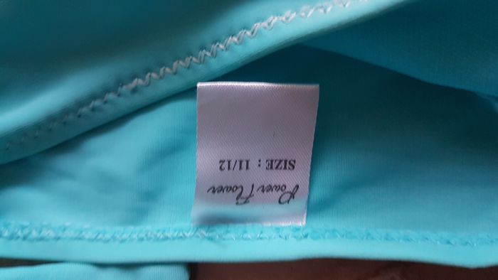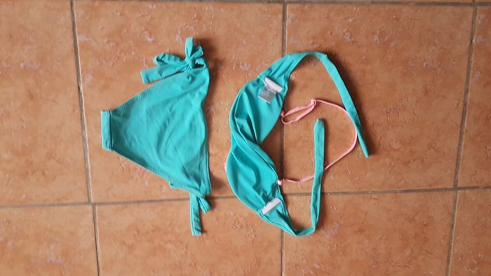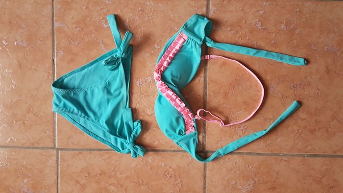 Maillot de bain 2 pièces fille Taille 11-12 ans Couleur vert et rose Haut : Bonnets croisés avec volant rose Se noue au cou Slip : Noeud sur les côtés pour régler à sa taille Marque Power Flower