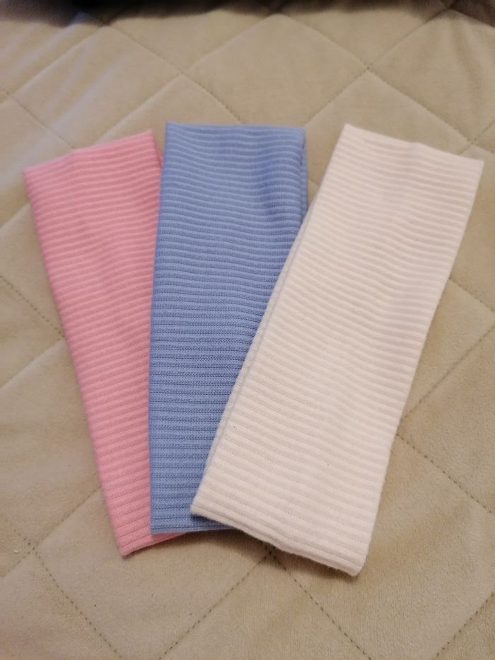 Lot de 3 bandeaux pour cheveux taille adulte couleur rose, bleu et crème Ma fille a mis 1 fois le crème mais comme elle a un appareil auditif c'est pas confortable et elle n entends plus. Les 2 autre ont jamais été mis. Lot indivisible