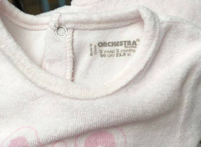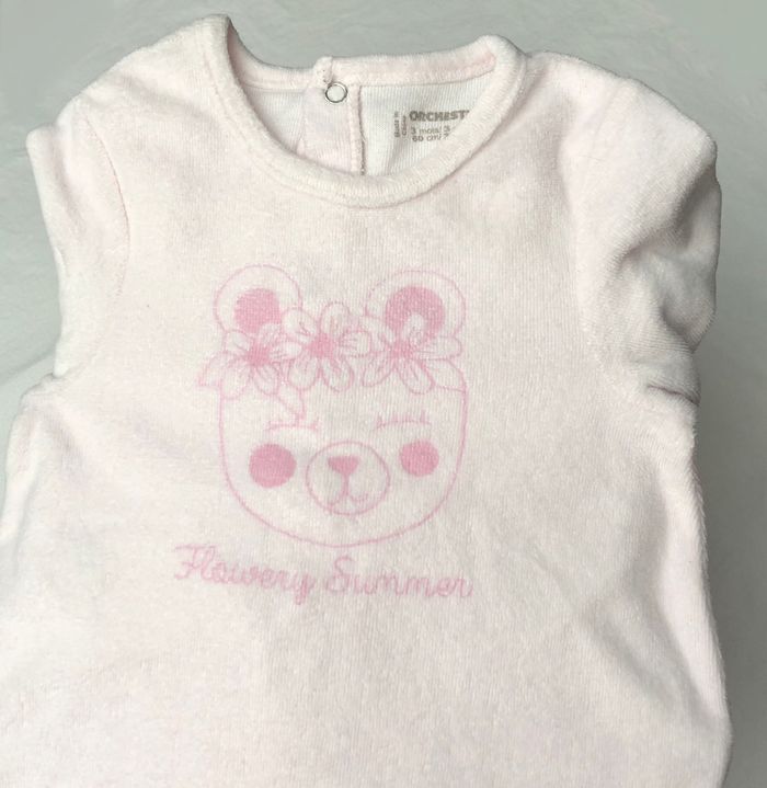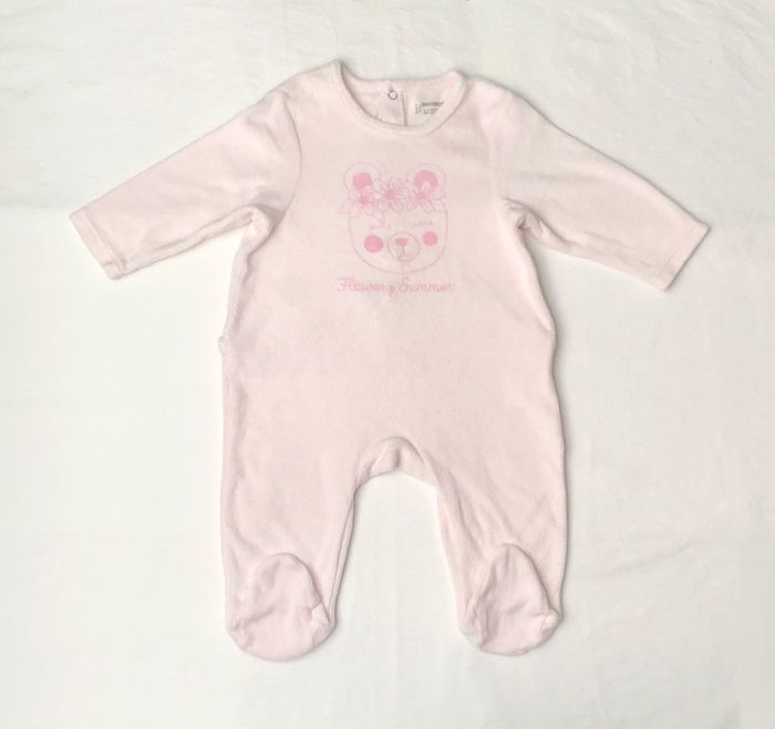 Pyjama, grenouillère, dors bien Orchestra, Taille 3 mois/ 60 cm. En velours rose très pâle, motif oursonne avec une couronne de fleurs. Ouverture par pressions dans le dos. En bon état, pas de tache, ni de trou. Le velours est encore doux. 🌸 Vous aimez cet article ? N’oubliez pas de visiter le reste de mon dressing en filtrant les tailles.