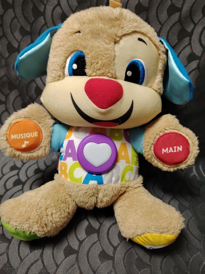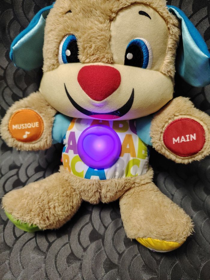Peluche d'éveil qui réagis au touché de bébé. Bébé peut apprendre les premiers mots, l'alphabet, les parties du corps etc... En parfait état. Fonctionne parfaitement. Voir dernière photo.