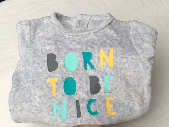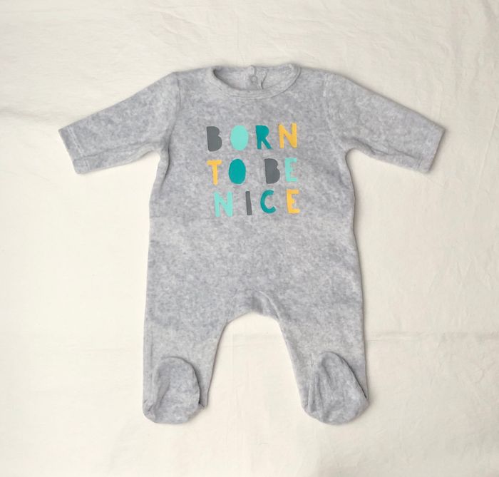 Pyjama hiver, grenouillère, dors bien Sergent Tex, Taille 3 mois. En velours gris clair chiné, message « born to be nice », gris foncé, bleu vert et jaune. Ouverture par pressions dans le dos. Comme neuf, pas de signe d’utilisation. Velours très doux. 🌸 Vous aimez cet article ? N’oubliez pas de visiter le reste de mon dressing en filtrant les tailles.