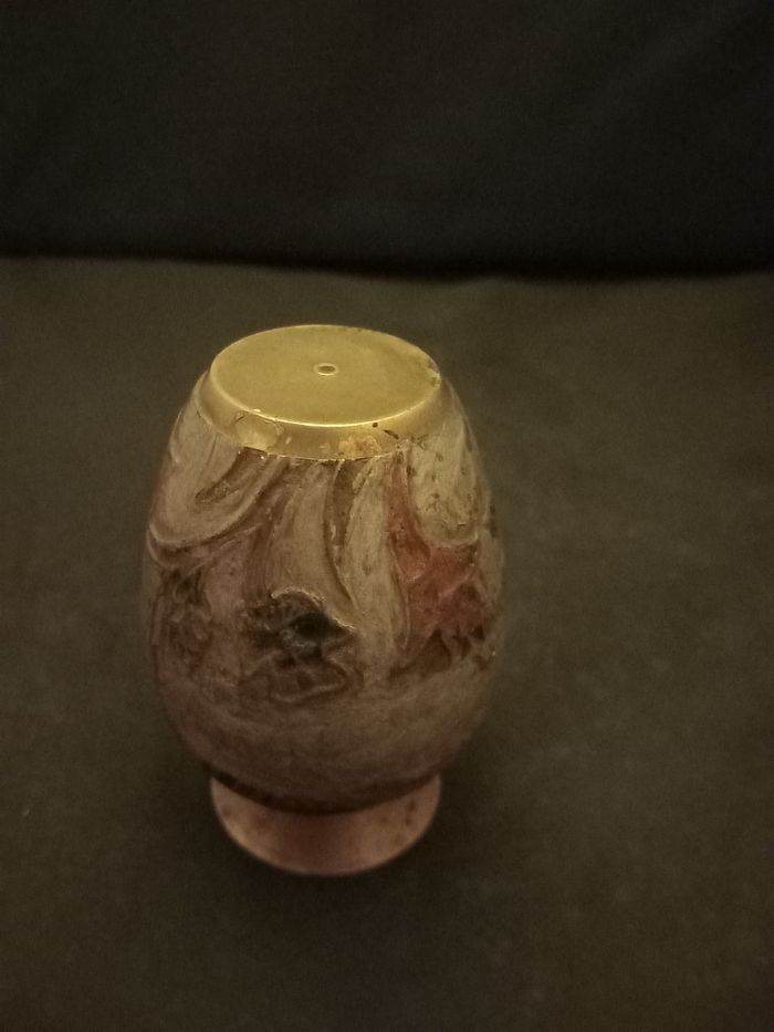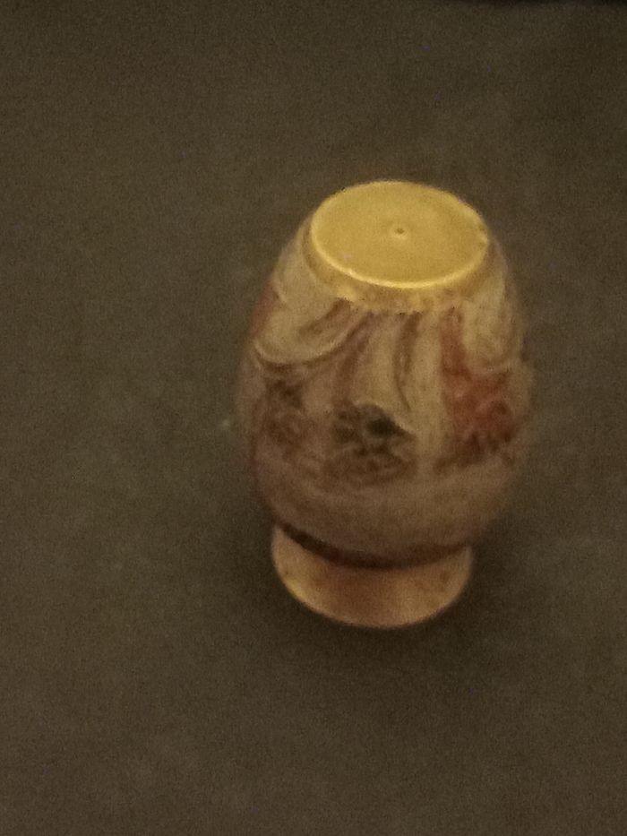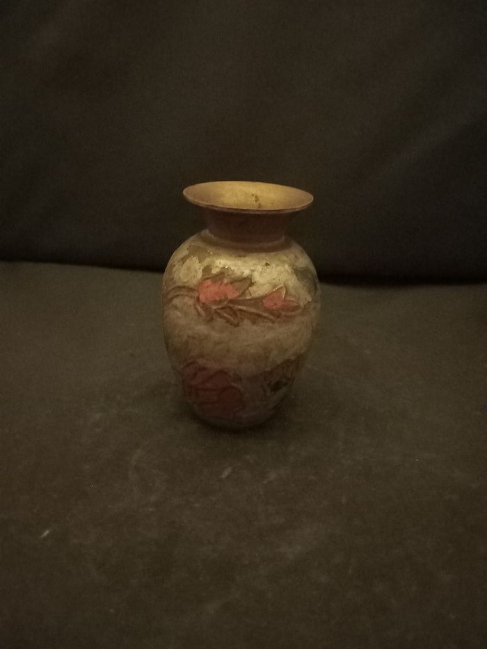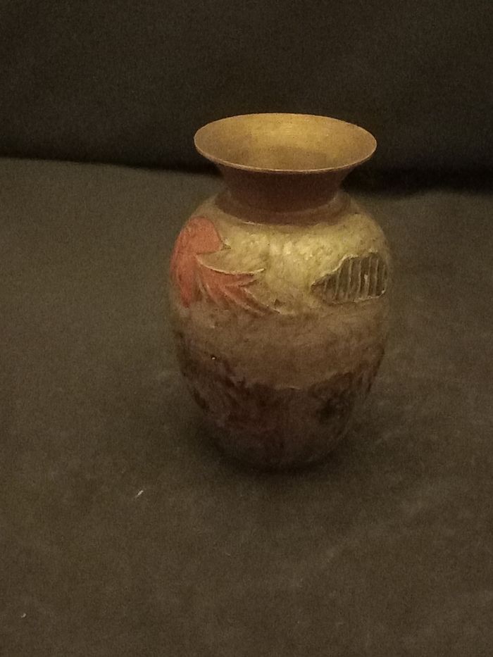 Petit vase Motifs fleurs Couleurs doré, argenté, gris et rouge Matières cuivre et métal Dimensions approximative : Hauteur 9cm : diamètre au plus large 5cm En bon état