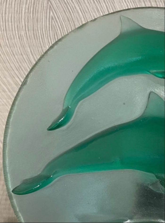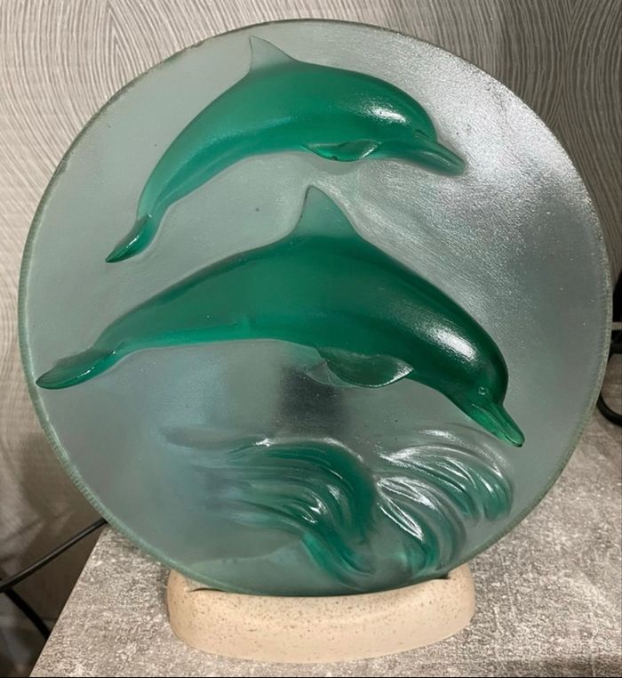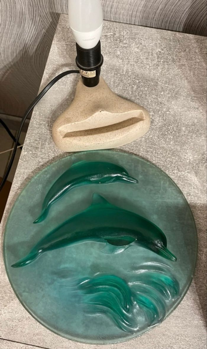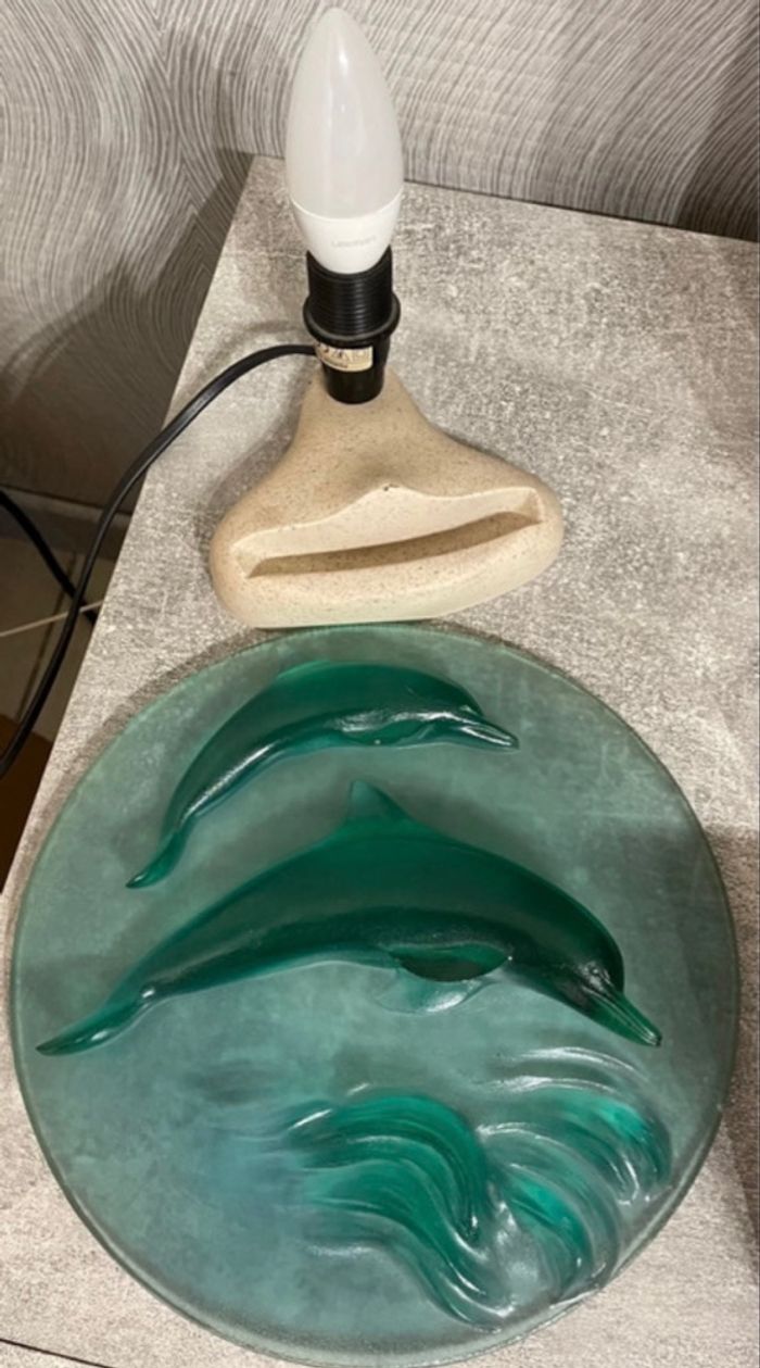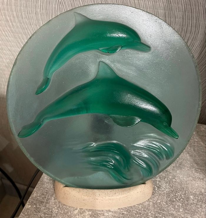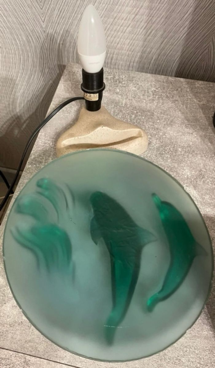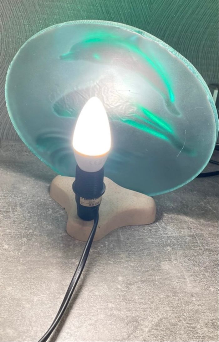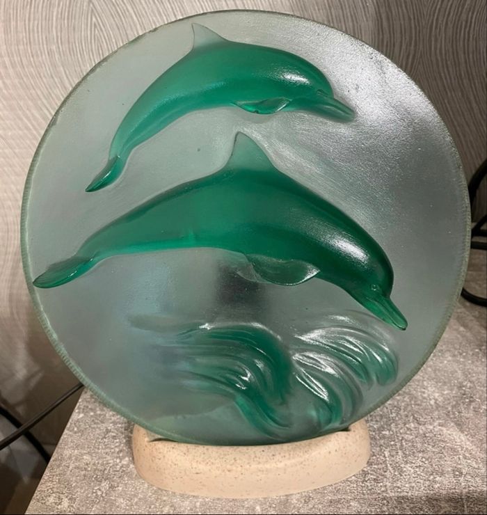 Lampe de chevet, Veilleuse Dauphins pour chambre d’enfant en verre en couleur vert et marbre Servi pas mal présente de léger imperfections il reste en bon état Dimension longueur 25 cm Largeur 22 cm