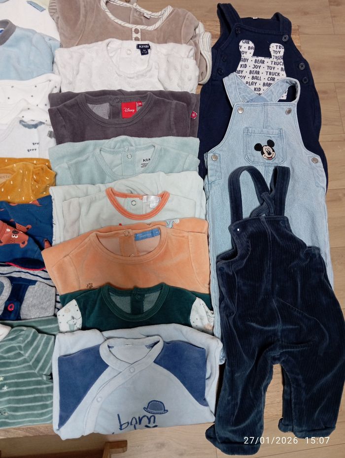 Le lot contient : - 5 Gilets - 4 Bodies - 9 Pull / Hauts - 12 Pantalons - 16 Pyjamas - 3 Salopettes (Elles s'ouvrent aussi au niveau des jambes pour changer la couche) Les vêtements sont en bon voir très bon état