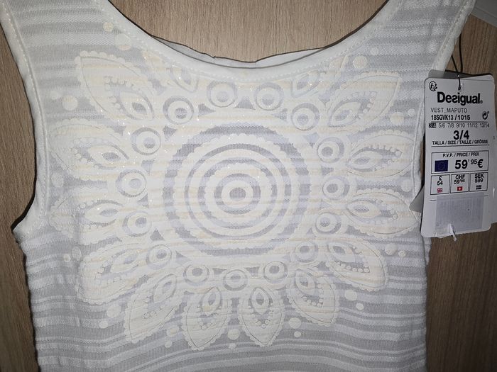 Très belle robe blanche Desigual NEUVE avec étiquette. Robe sans manches avec un petit noeud dans le dos Motif: arabesque Taille : 3/4 ans