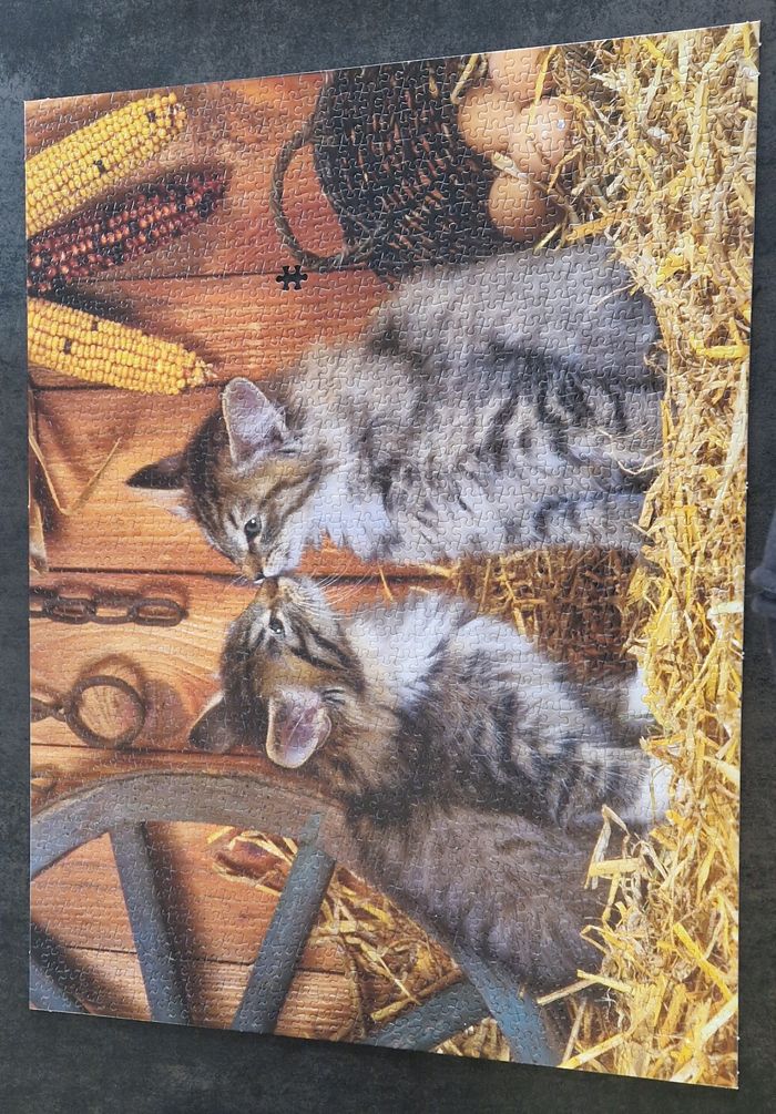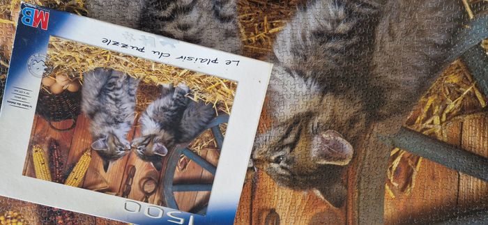 Puzzle MB de 1500 pièces intitulé "Le baiser des chatons" représentant 2 chatons dans une grange - Pièces épaisses et brillantes de qualité - Dimensions : voir photos - Niveau de difficulté : moyen - classé "bon état" car, acheté d'occasion, il manque 1 pièce et 2 sont écornées (voir photos - le prix en tient compte), l'intégralité du reste du puzzle est en TB, voire excellent état. Autres puzzles de 1000 ou 1500 pièces également en ligne et réductions possibles sur les lots de puzzles ou autres articles. #isa91jeuxetjouets #isa91puzzles #isa91lot3achetésle4eoffert NB : Par souci écologique, je ne fais pas d'envoi en-deçà de 4€, merci de composer un lot et pour votre compréhension.