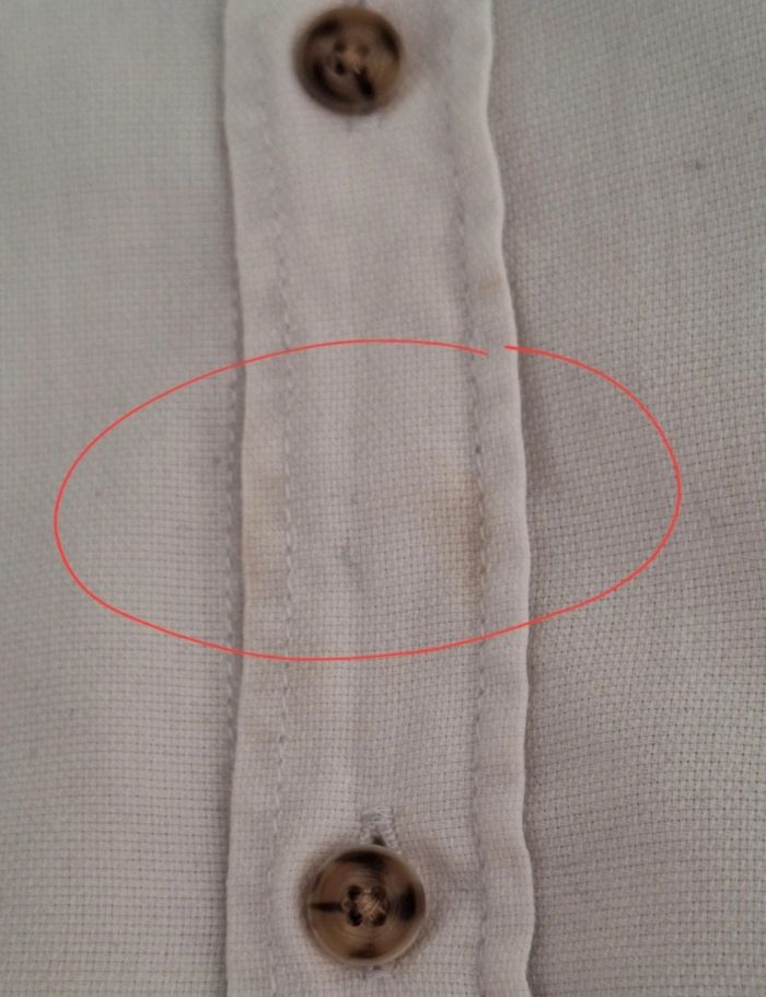 Une poche à la poitrine. Col 43/44. Marque Canda. Une petite trace devant : pourquoi ne pas la teindre, elle serait parfaite, ou avec une cravate, ça ne se verrait pas. En 100 % coton.