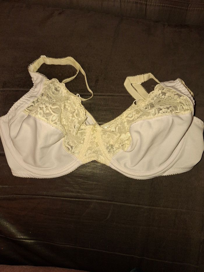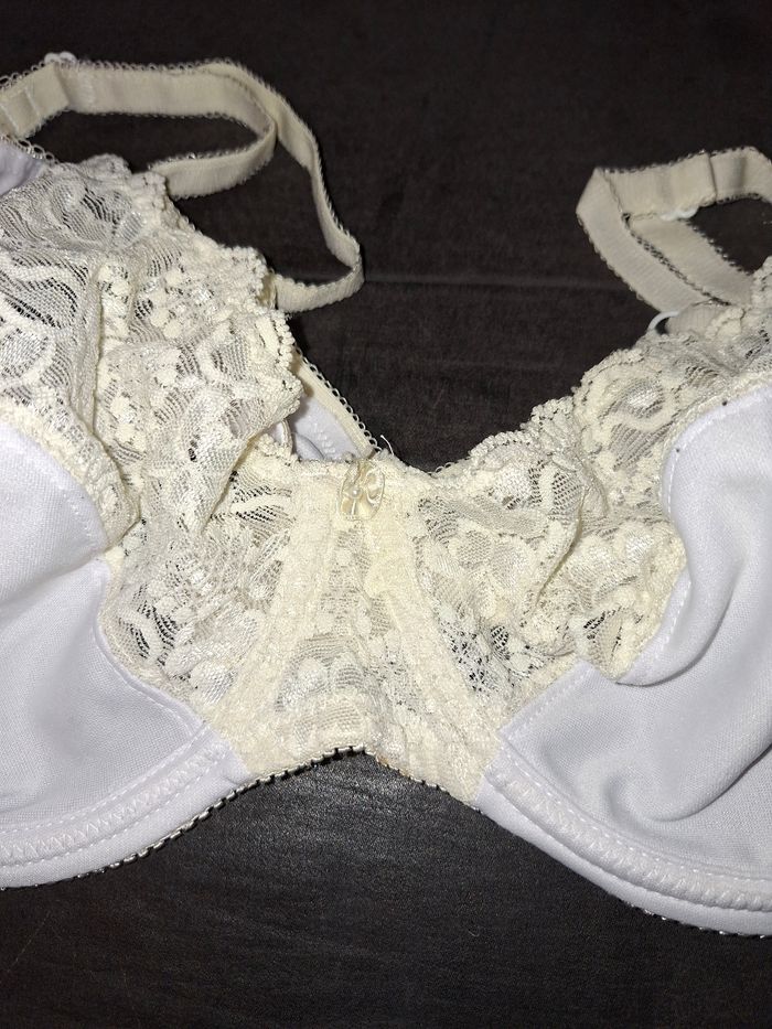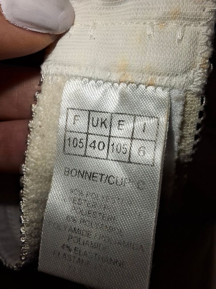 Vends soutien-gorge blanc, un modèle classique et confortable idéal pour le quotidien. Il présente une jolie dentelle fleurie sur la partie supérieure des bonnets pour une touche féminine et élégante. ​Marque : Non spécifiée (étiquette de taille uniquement). ​Taille : 105C (indiqué sur l'étiquette). ​Design : Bonnets avec empiècements en dentelle et tissu lisse sur le bas. ​Détails : Petit décor floral avec un strass discret à l'entre-bonnet. ​Maintien : Bretelles réglables et fermeture au dos par double agrafage sur deux positions pour un ajustement optimal. ​État : Bon état général.
