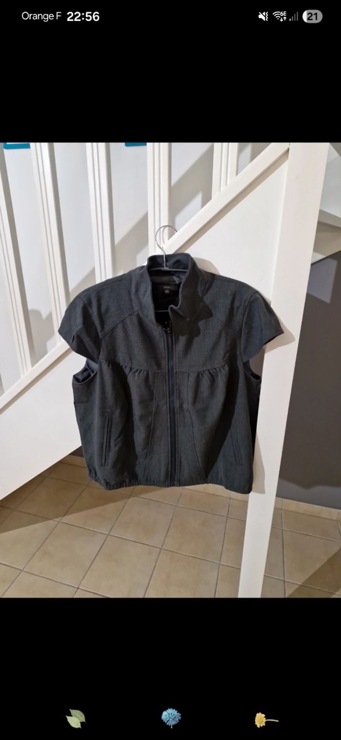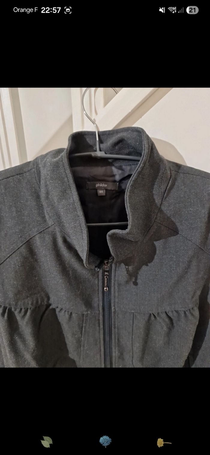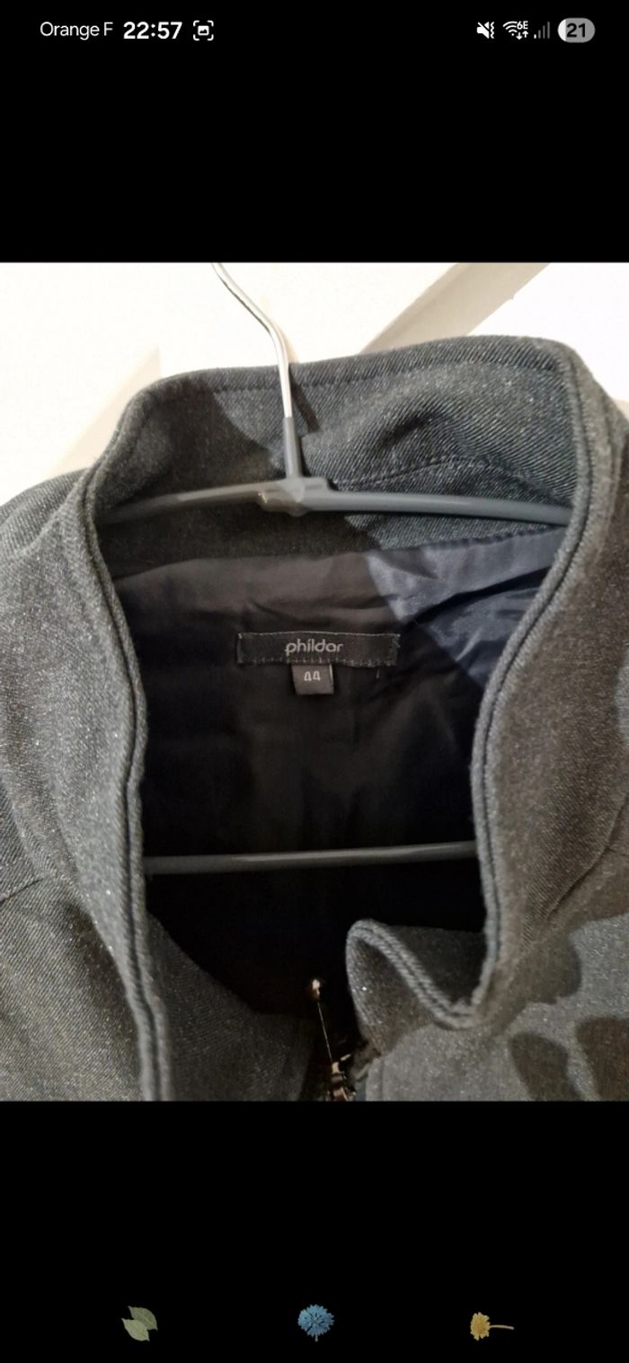 Veste Phildar gris, 44, manche courte, fermeture éclair, fausse poche, légèrement élastique en bas, doublure. 41 cm épaule à épaule 55 cm de longueur