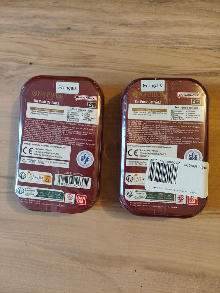 Bonjour, je vends ce lot de deux mini tins one piece volume 1 scellées ⭐ Chaque tin contient deux booster OP10 et un carte DON Envoi rapide et soigné 💨 Plus de photos sur demande 📷