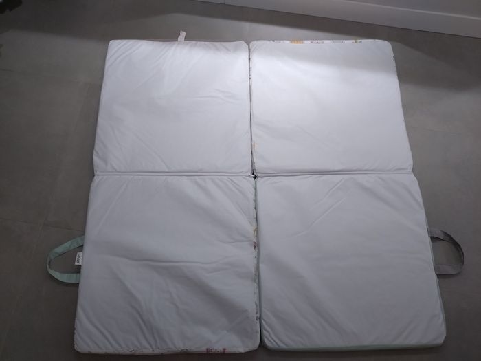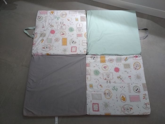 Tapis de sol 120 cm x 120 cm, de marque Tinéo, motifs indien. Déhoussable et lavable. Pliable (60 cm x 60 cm), poignées et pochette de voyage.