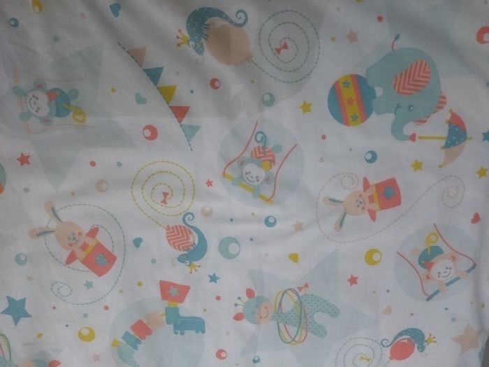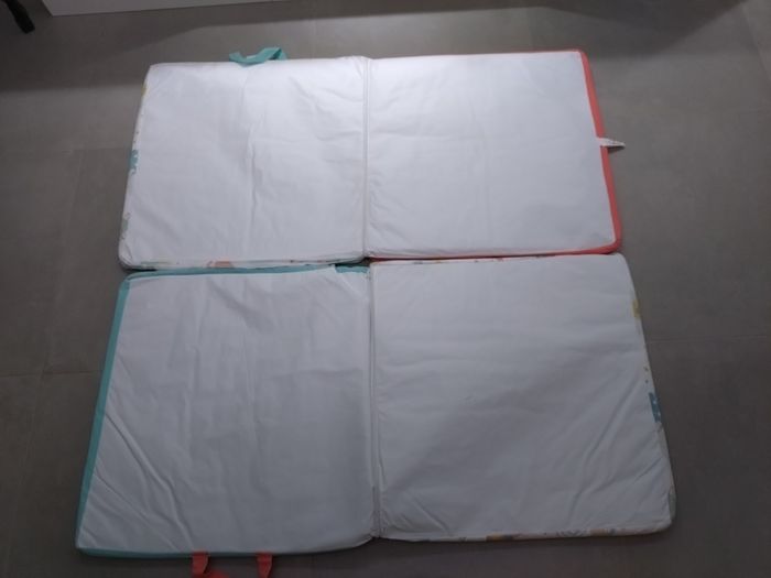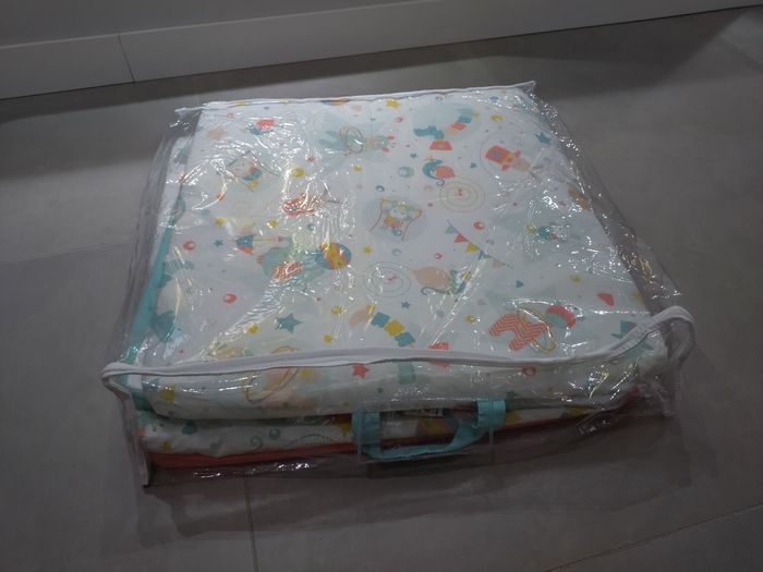 Tapis de sol 120 cm x 120 cm, de marque Tinéo, motifs cirque. Déhoussable et lavable. Pliable (60 cm x 60 cm), poignées et pochette de voyage.