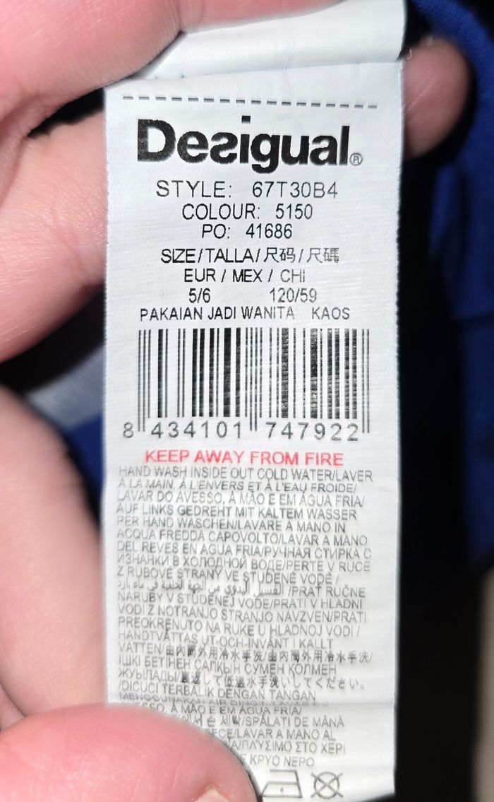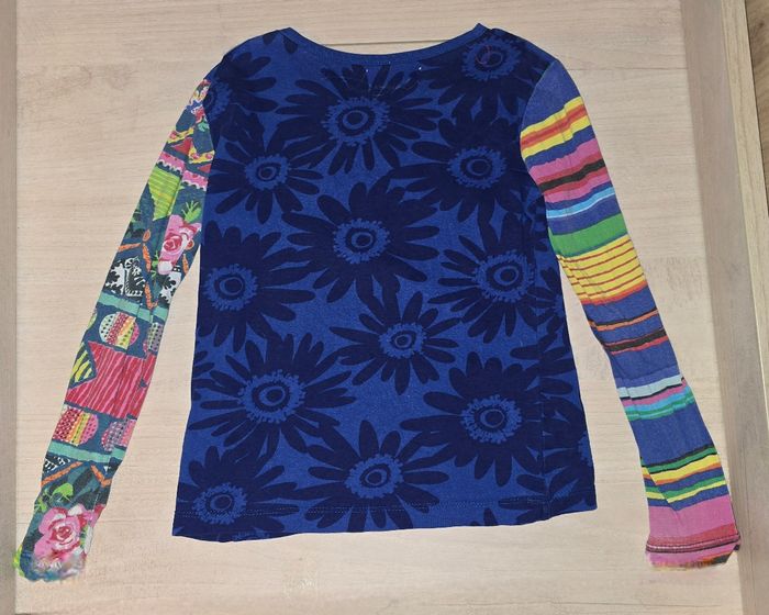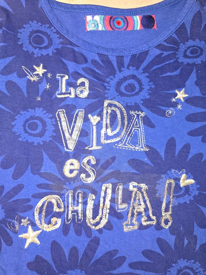 Tee shirt bleu Desigual, manches longues colorées Motif : "La vida es chula !" Taille : 5/6 ans Très bon état
