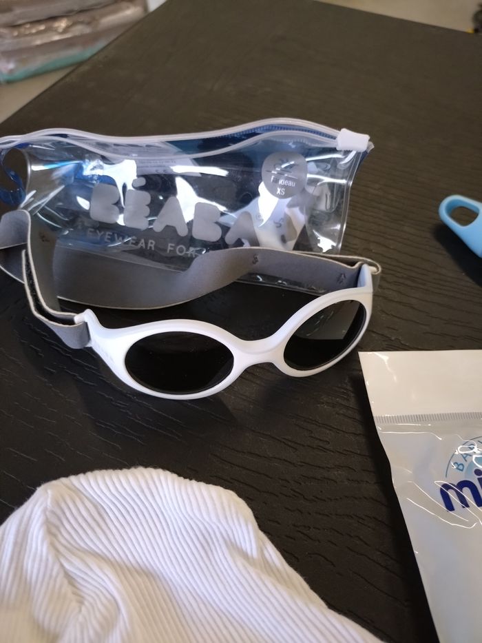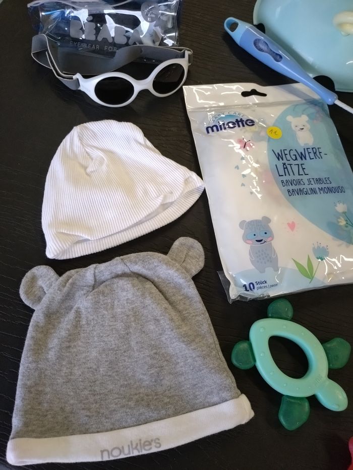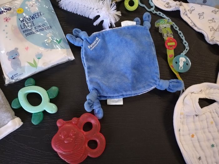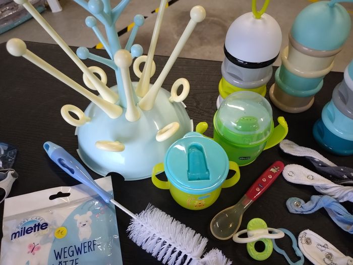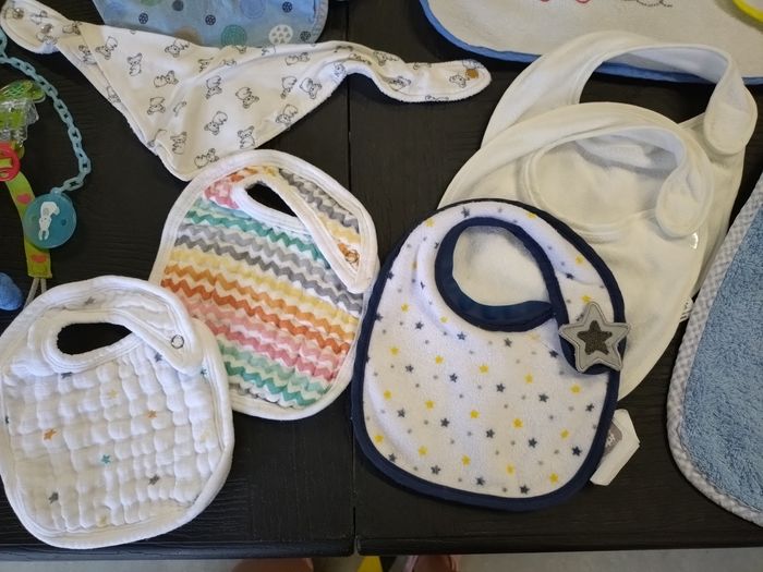 Lot de divers accessoires pour bébé : Bavoirs pour repas en coton, bavoirs jetables, égouttoir à biberons Béaba, goupillon, portes sucette, petite cuillère, accessoires pour les dents de bébé quand elles poussent, tours de cou quand bébé bave, biberons Béaba, dosettes de lait Béaba, verres à bec, lunettes de soleil Béaba XS, petits bonnets.