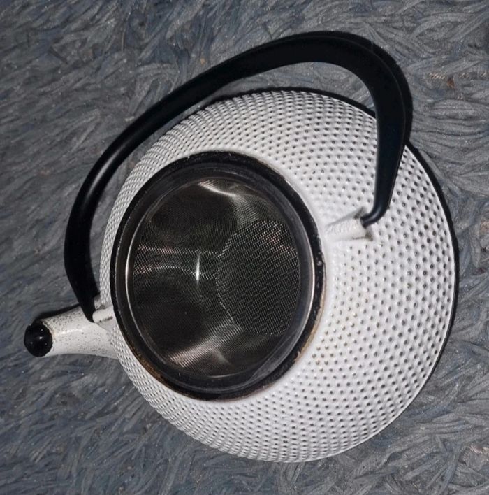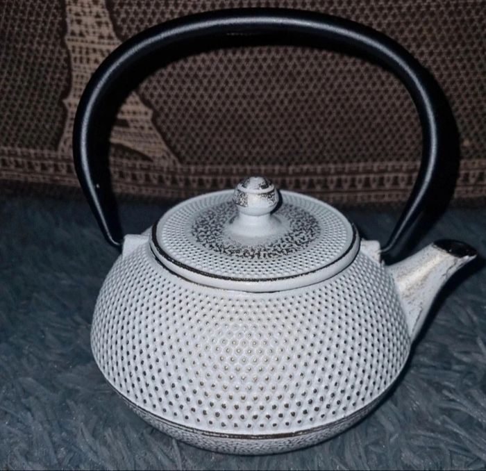 Théière en fonte blanc ,doré et noir style vintage, -dimensions théière environ 17,5X15,5X16,5cm , -dimensions environ tamis 5cm, -environ 700ml, résistante à la chaleur et garde la chaleur plus longtemps, tamis en inox pour le thé frais ,poignée pliable, idéal cadeau Noël ou autres 👍🏼