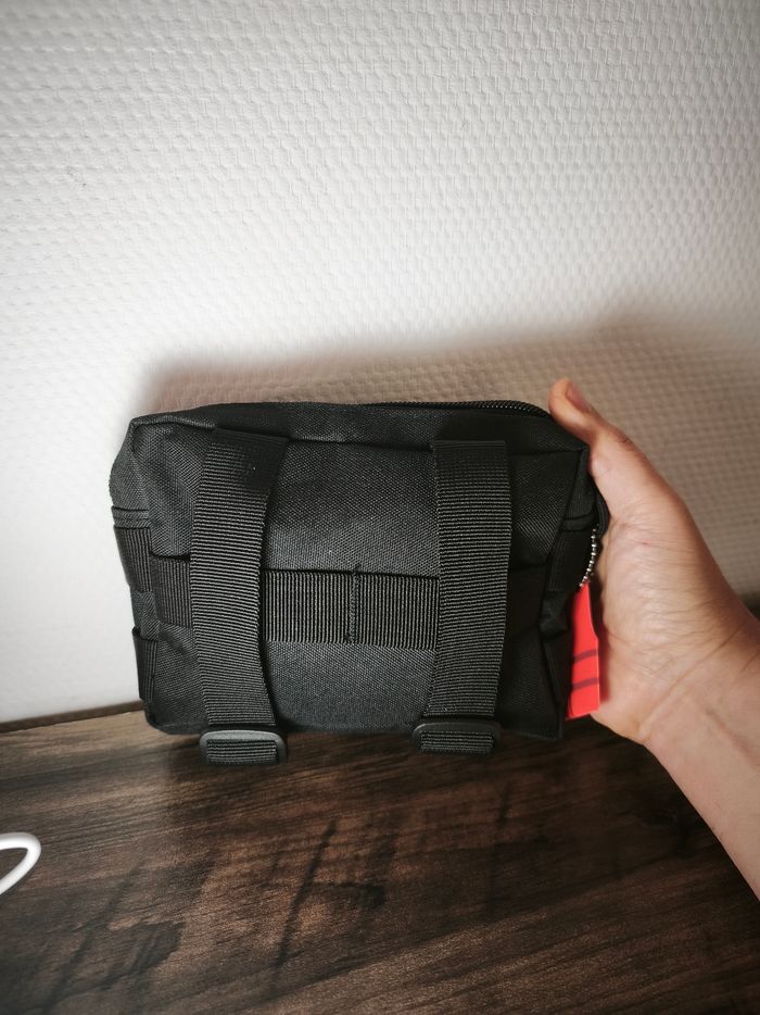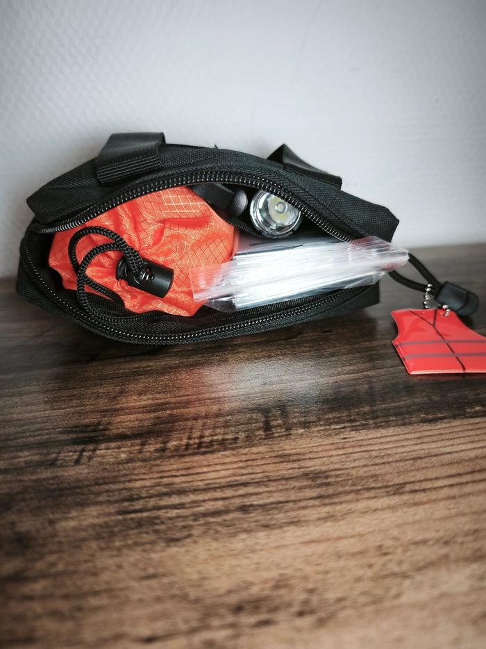 Kit urgence unique pour faire face aux imprévus en déplacement. Sac résistant et compact Une lampe torche a led câble fourni Sac de couchage thermique Couverture de survie Outil brise vitre et coupe ceinture