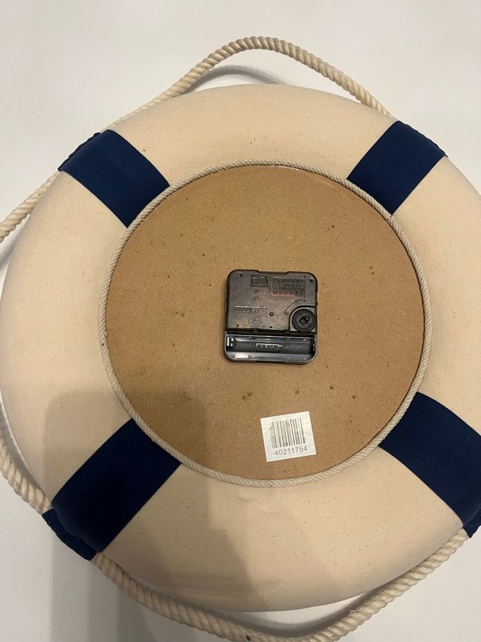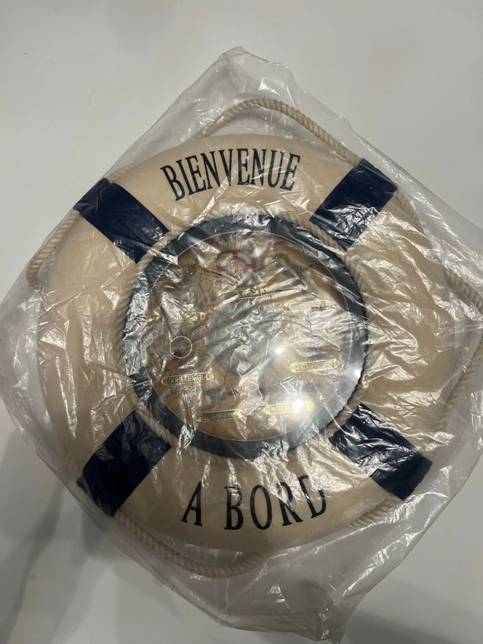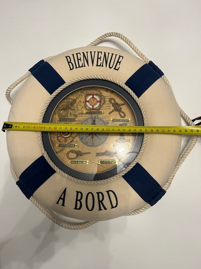 🛟 Horloge murale bouée marine “Bienvenue à bord” Superbe horloge murale en forme de bouée de sauvetage, parfaite pour une déco bord de mer, maison de vacances, salle de bain ou chambre d’enfant thème marin 🌊 🧭 Détails : • Forme bouée avec corde décorative • Inscription “BIENVENUE À BORD” • Centre vitré avec décor marin (carte, boussole, nœuds marins, gouvernail…) • Fonctionne à pile (mécanisme quartz au dos) • Couleurs : beige et bleu marine 📏 Dimensions : Environ 35 cm de large (voir photo avec mètre) ✨ État : Très bon état général. Objet décoratif propre et soigné. N’a jamais servi. Pas de casse sur la vitre. Légères marques possibles liées au stockage mais rien de gênant. 🏡 Idéal pour une déco bord de mer, bateau, cabine, salle de bain marine, chambre thème pirate/marin.