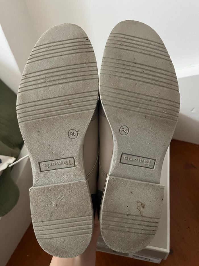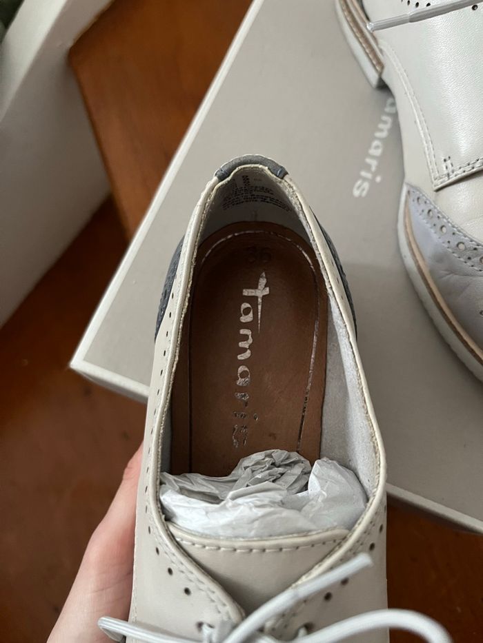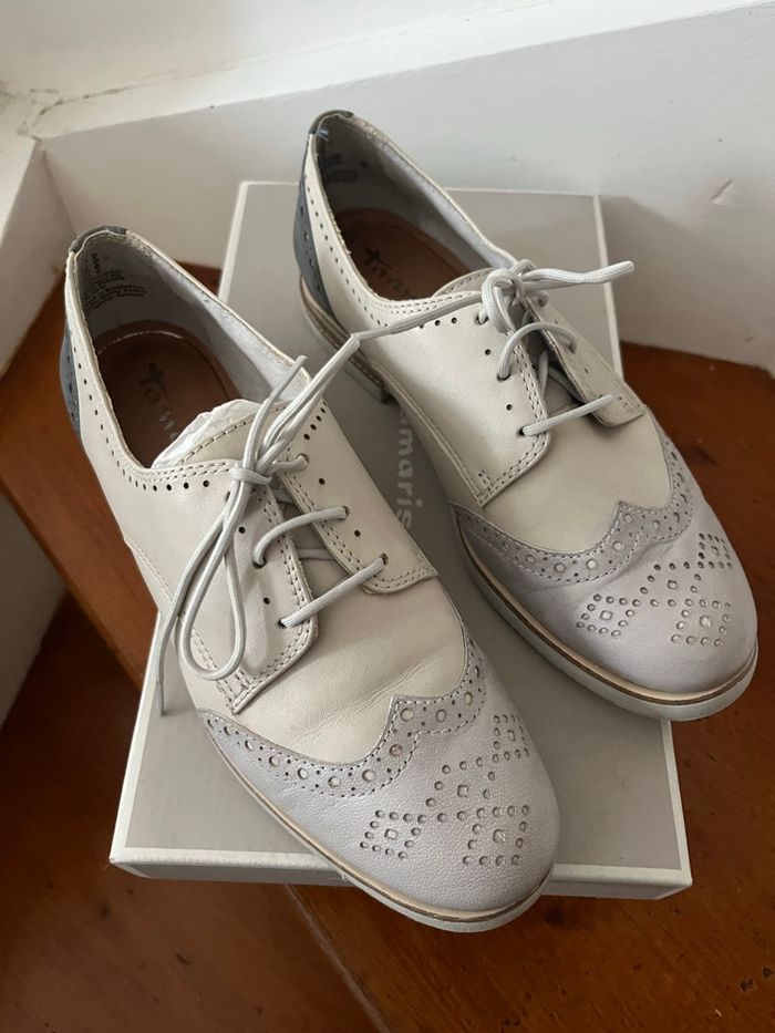 Chaussures de ville type Derbies / richelieu Tamaris. En très bon état, porté quelques fois. Taille 36. Gris bleu Vendues avec la boîte.