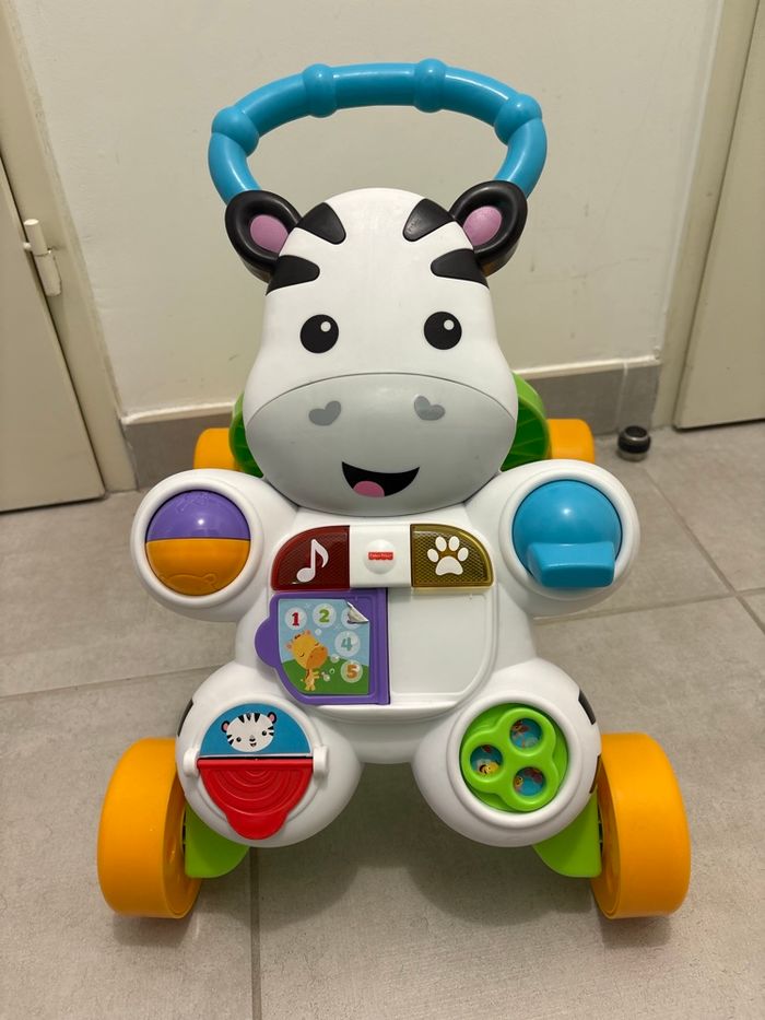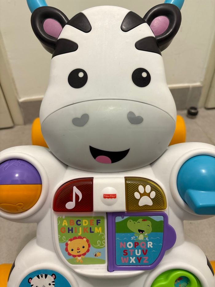 Mon Trotteur Zèbre Parlant, pour accompagner bébé dans l’apprentissage de la marche. - Marque : Fisher-Price - Fonctionnalités : Sonore, musical, avec différents boutons et formes à manipuler - Accessoires inclus : Piles