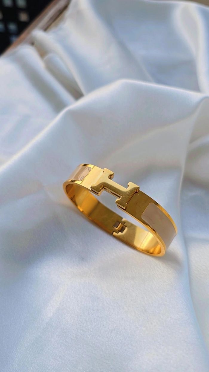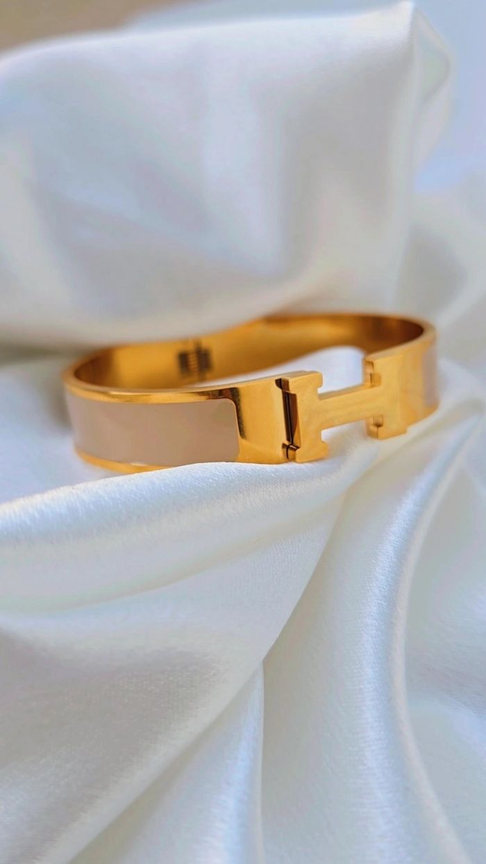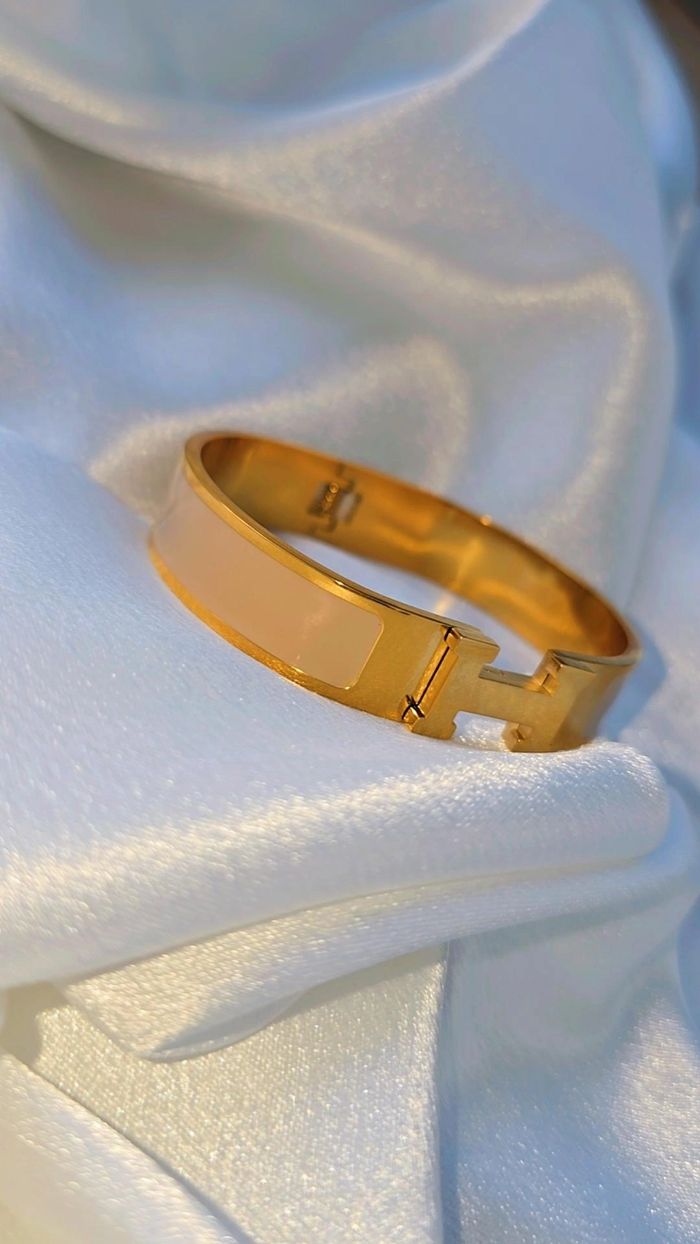 ​Sublime bracelet jonc rigide en métal doré, inspiré d'un design iconique de luxe. Il est orné d'une finition de couleur beige/nude, très élégante et facile à porter