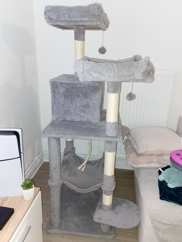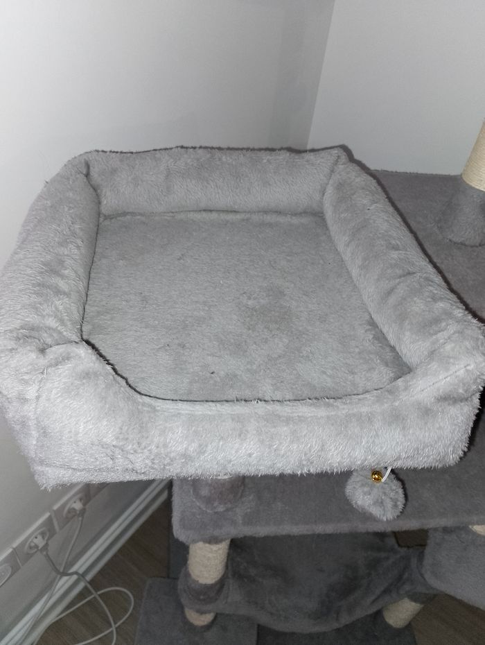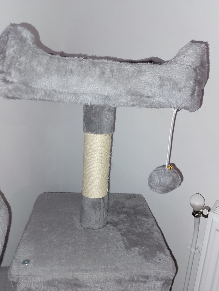 Arbre a chat Avec 2 rectangles pivotant 2 panières, 1 panier en suspension 1 corde 2 balles 1 case pour se caché dedans En très bon état Sera démonté pour la vente avec mise étiquette où autre avec les numéros pour le montage facilement