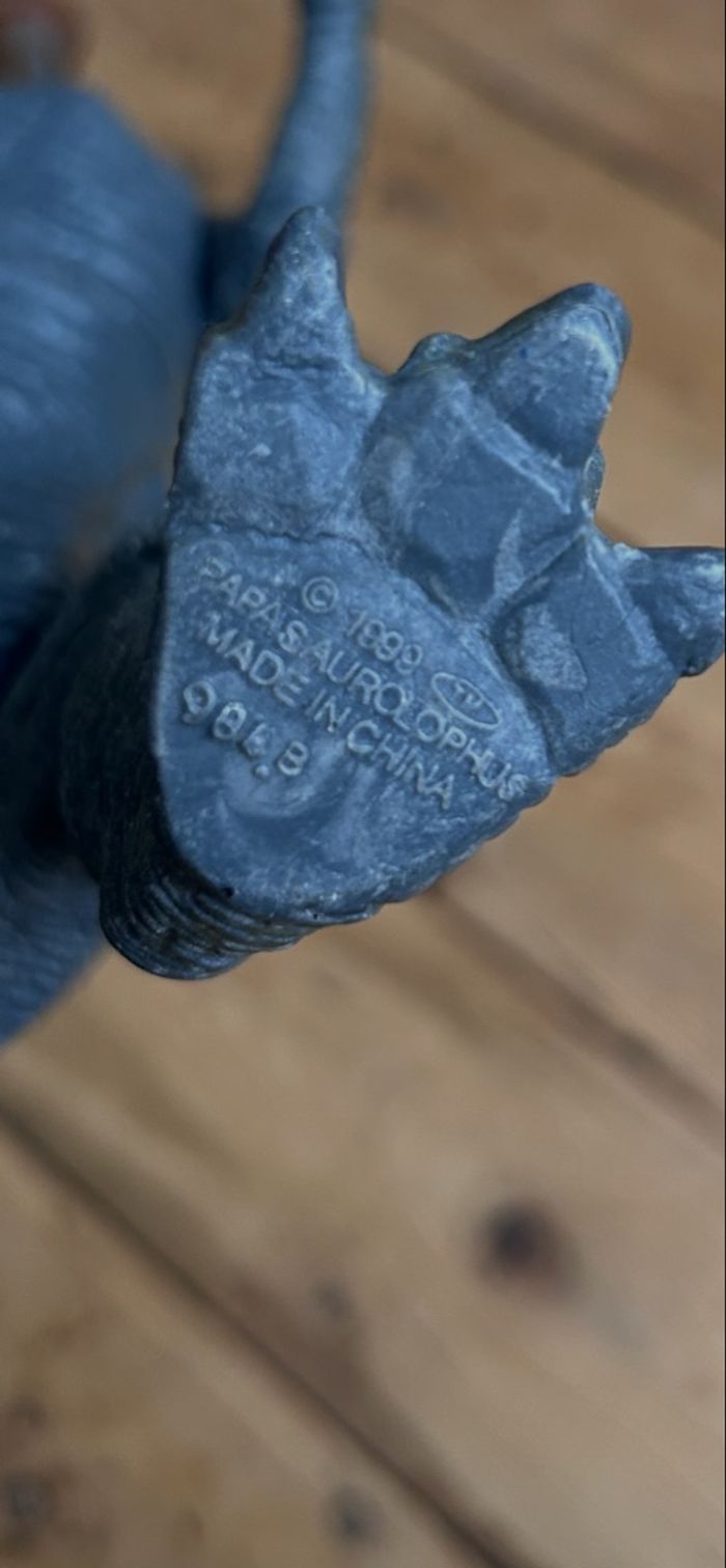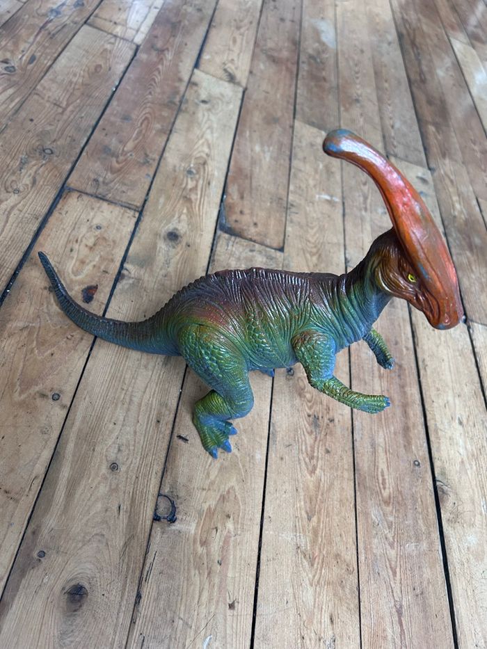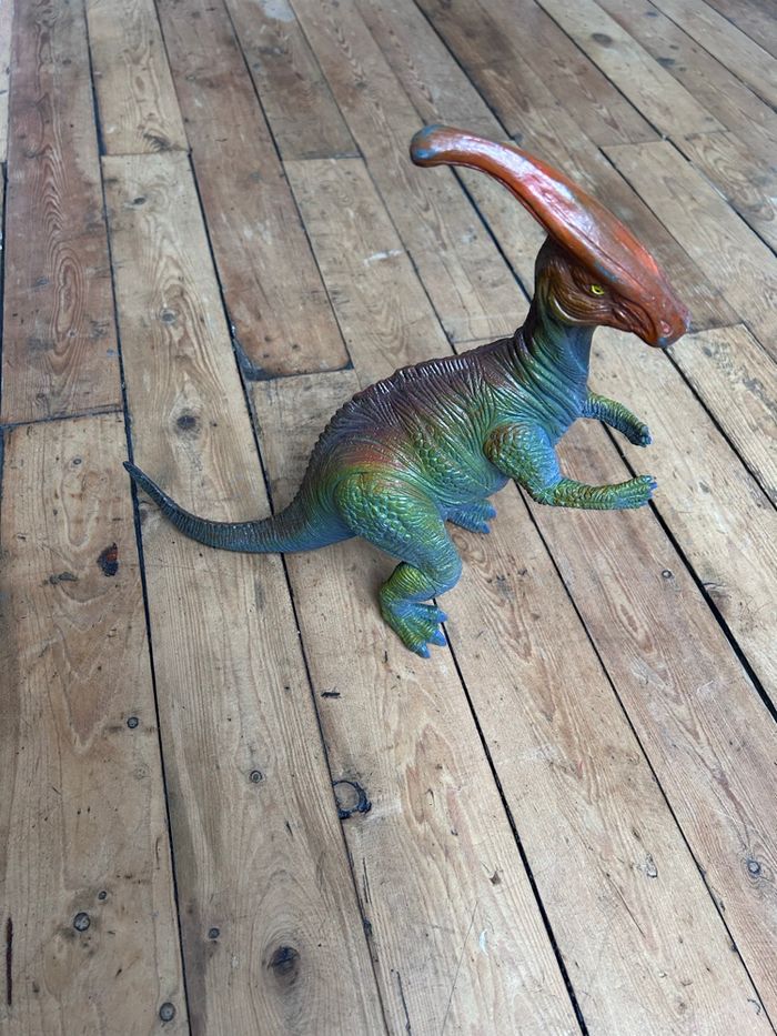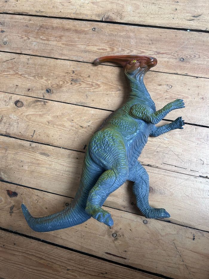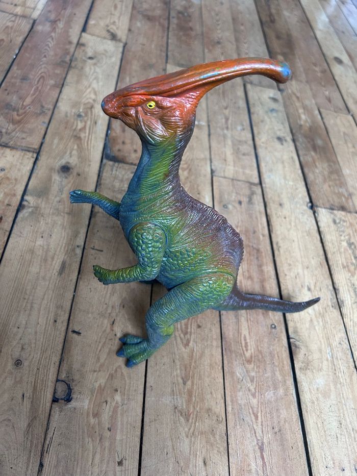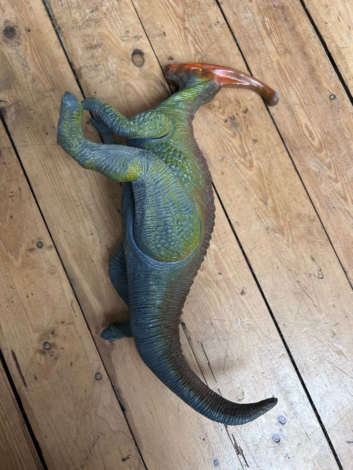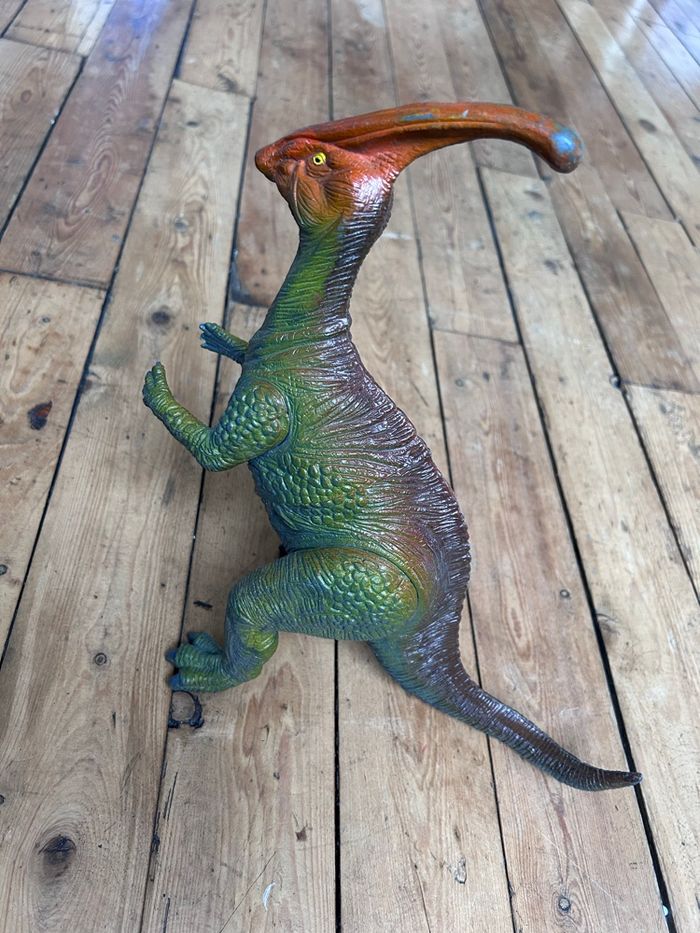 Grand dinosaure parasaurolophus 1999 Bon état car la couleur est partie au museau et sur la crête Hauteur environ 35 cm