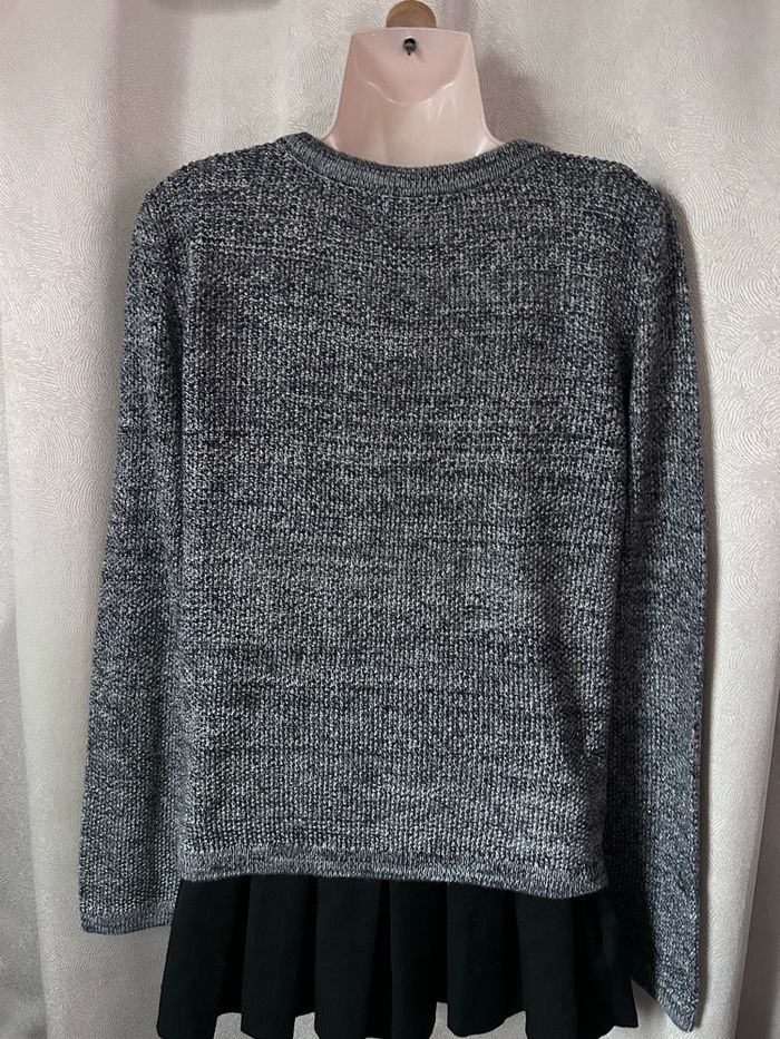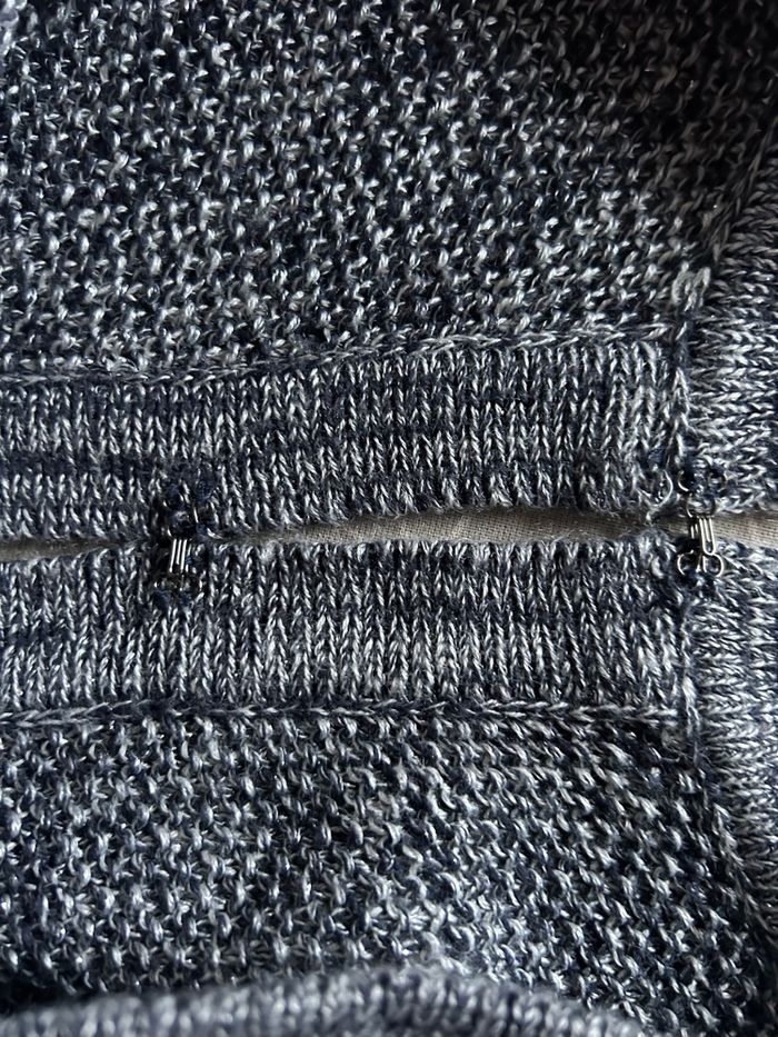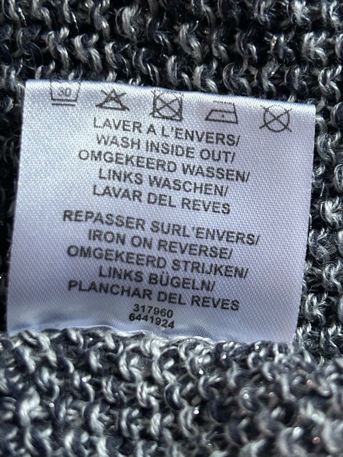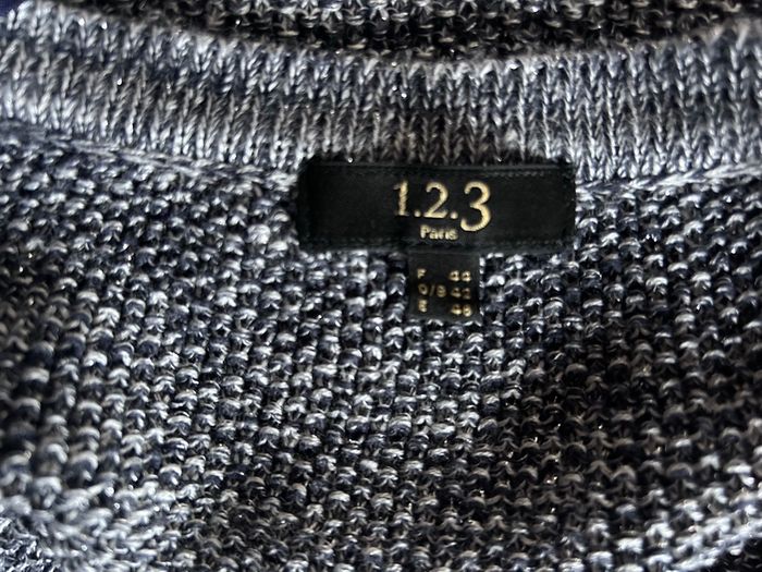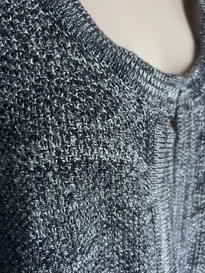 Gilet cardigan tricot point de riz, chiné bleu marine gris et argenté 2 poches Fermeture par crochets Taille 44 53% coton 41% acrylique 4% polyester 2% fibres métalliques maison 1.2.3 Carrure 42 cm Aisselle à aisselle 52,5 cm Longueur 58 cm