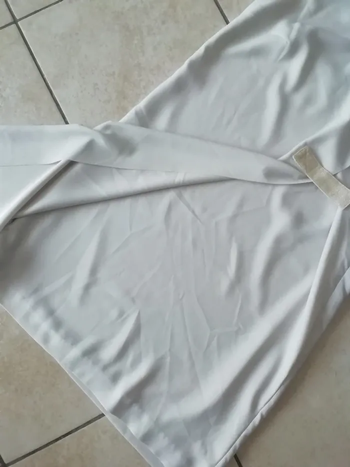 DE COULEUR ECRU. TRES BELLE COUPE ET SUPERBE TISSU FLUIDE ET BIEN RETOMBANT. PAN LEGEREMENT ASSYMETRIQUE DEVANT, FAUX CACHE COEUR. ETAT NEUVE CAR PORTEE UNE SEULE FOIS, QUELQUES HEURES A UNE CEREMONIE. TAILLE 38, MAIS PEU AUSSI ALLER A UN LEGER 40 , VOIR MENSURATIONS CI DESSOUS : LONGUEUR : env 90cm. LARGEUR AISSELLE : env 47cm.