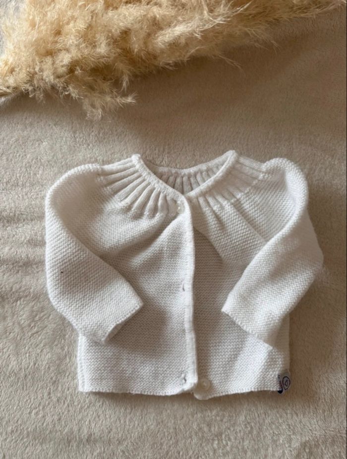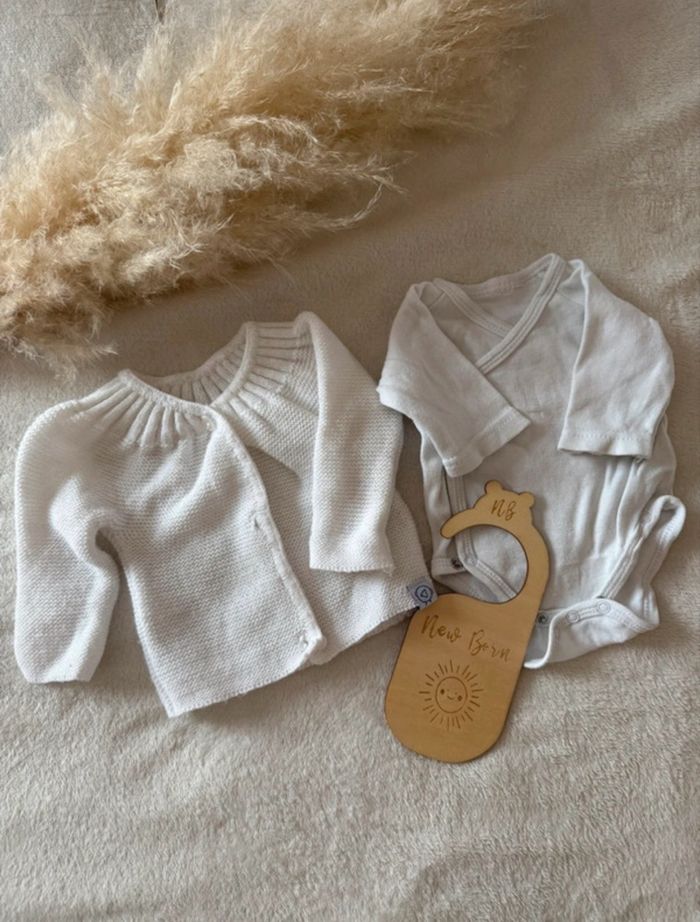 Lot d’un gilet en maille et un body manches longues blanc. A servi mais en parfait état Taille naissance